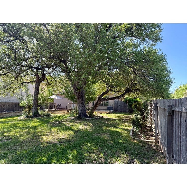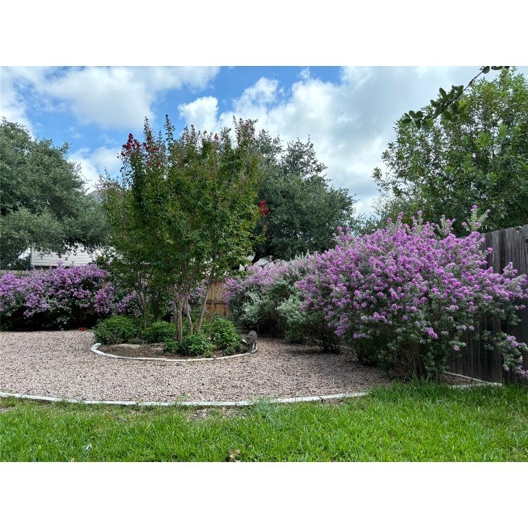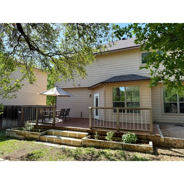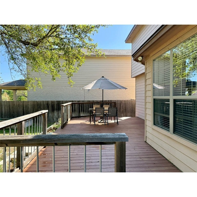 Awesome corner lot on a cul-de-sac with a beautiful park like setting and huge back yard. Laminate flooring throughout most of the home with vinyl flooring in wet areas. No Carpet! Fabulous island kitchen with loads of cabinet/counter space, breakfast dining area, huge pantry/utility room, and stainless and black electric range/oven combo, stainless dishwasher, and disposal. The huge family room has lots of windows and extends into the adjacent formal dining area. All bedrooms are on the upper level, each has a sizable walk-in closet. Large primary bedroom with ceiling fan and adjacent room which is perfect for a lounging area, home office or nursery. The primary bathroom offers two separate vanities, a large garden tub/shower combo, two walk-in closets, linen closet and toilet area. Fourth bedroom/flex/game room (no closet but could use part of adjacent room for closet space) and has a private entrance onto the upstairs outdoor deck. Heavily treed lot with lushly landscaped backyard, big backyard deck and sprinkler system. The front of the house has a covered porch and an upper-level covered deck. In acclaimed Leander ISD and Elementary School, Middle School and High School are all approximately one mile from this property. This means a short walk or drive to all the assigned schools in just a few minutes. This property is a real winner, so check it out today!