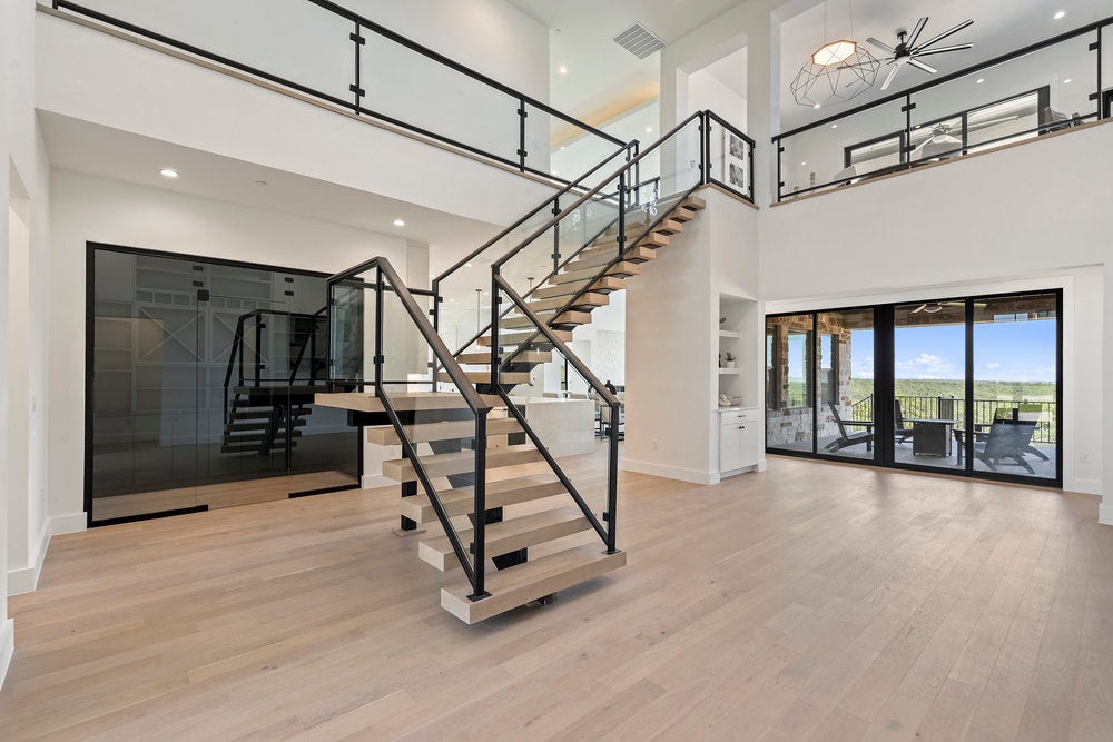 Welcome to 6101 Adhara Pass, a standout luxury home in Milky Way at River Place—Austin’s highest elevation and the first new home community in this sought-after area in over a decade. This exclusive M Signature residence showcases timeless architecture, a striking heritage oak, and a side-entry 3-car garage that enhances its impressive curb appeal. Inside, you’re greeted by soaring 20-foot ceilings in both the foyer and great room, a dramatic open staircase, and a glass-enclosed wine cellar that makes an unforgettable statement. The designer kitchen is built for both style and function, featuring a waterfall center island, custom 63-inch soft-close cabinetry, a JennAir 6-burner dual-fuel range with griddle, and a spacious butler’s pantry. Wide-plank wood flooring extends through the main living areas, study, gameroom, media room, and primary suite. Each bedroom includes a private en suite bath, along with powder rooms thoughtfully placed on both levels. A see-through double-sided fireplace warms the great room and den, while the upstairs gameroom opens to a covered balcony with scenic views. The primary suite is a true retreat, with a luxurious bath offering dual split vanities, a soaking tub set against a tile accent wall, and a walk-in shower. The oversized closet connects directly to a well-appointed utility room for added convenience. Built with energy-efficient spray foam insulation, Andersen windows, a tankless water heater, and high-end finishes throughout, this home reflects the quality and craftsmanship of the M Signature series. Located within minutes of River Place Elementary, Vandegrift High, Sun Tree Park, and River Place Country Club, this home combines elevated design with an unbeatable location.