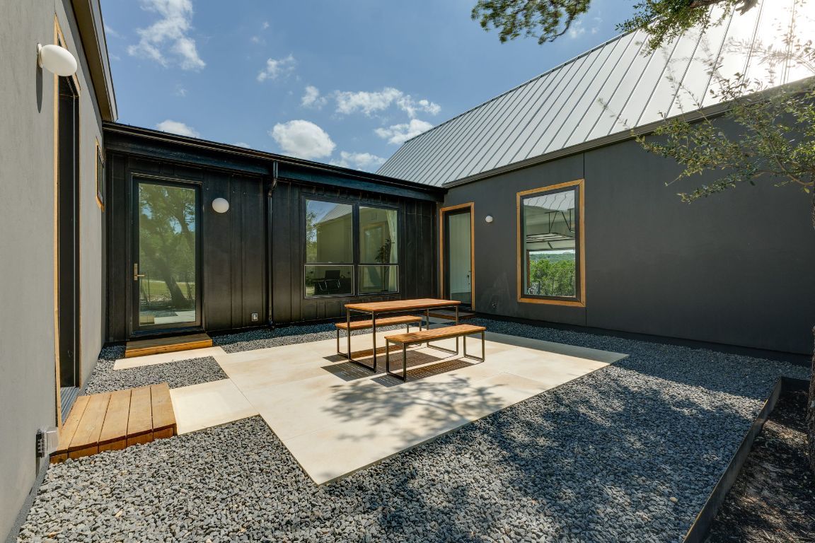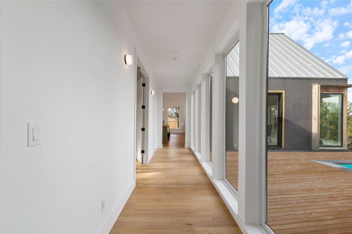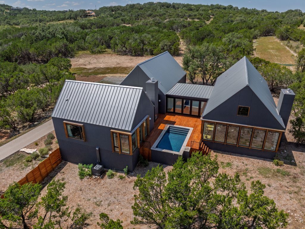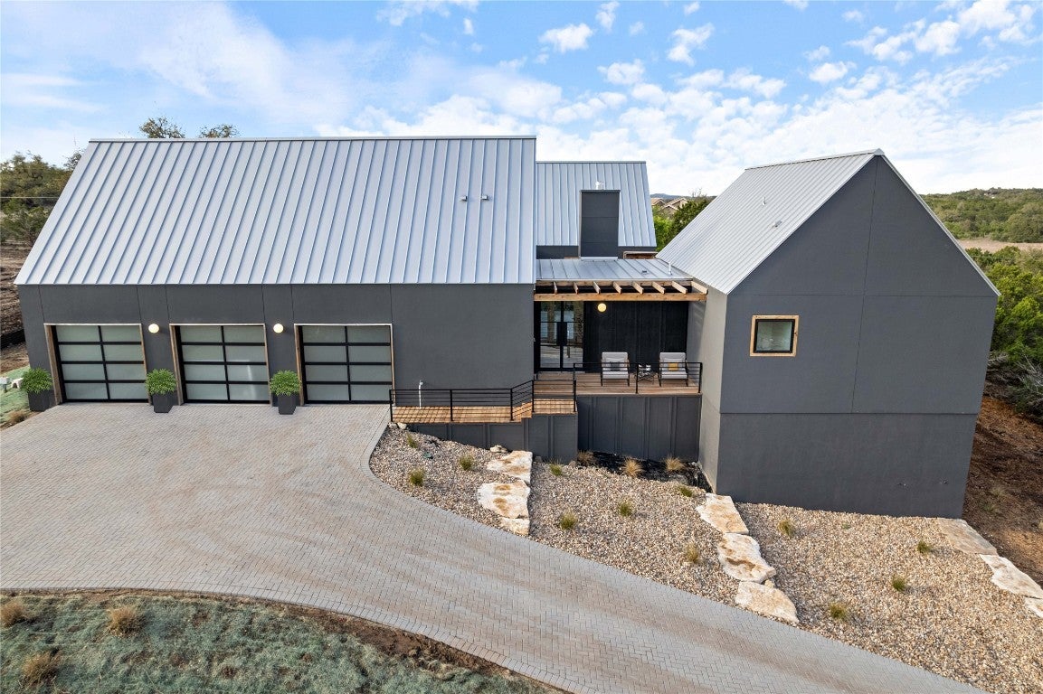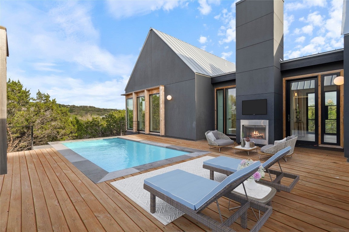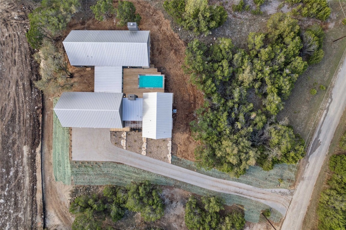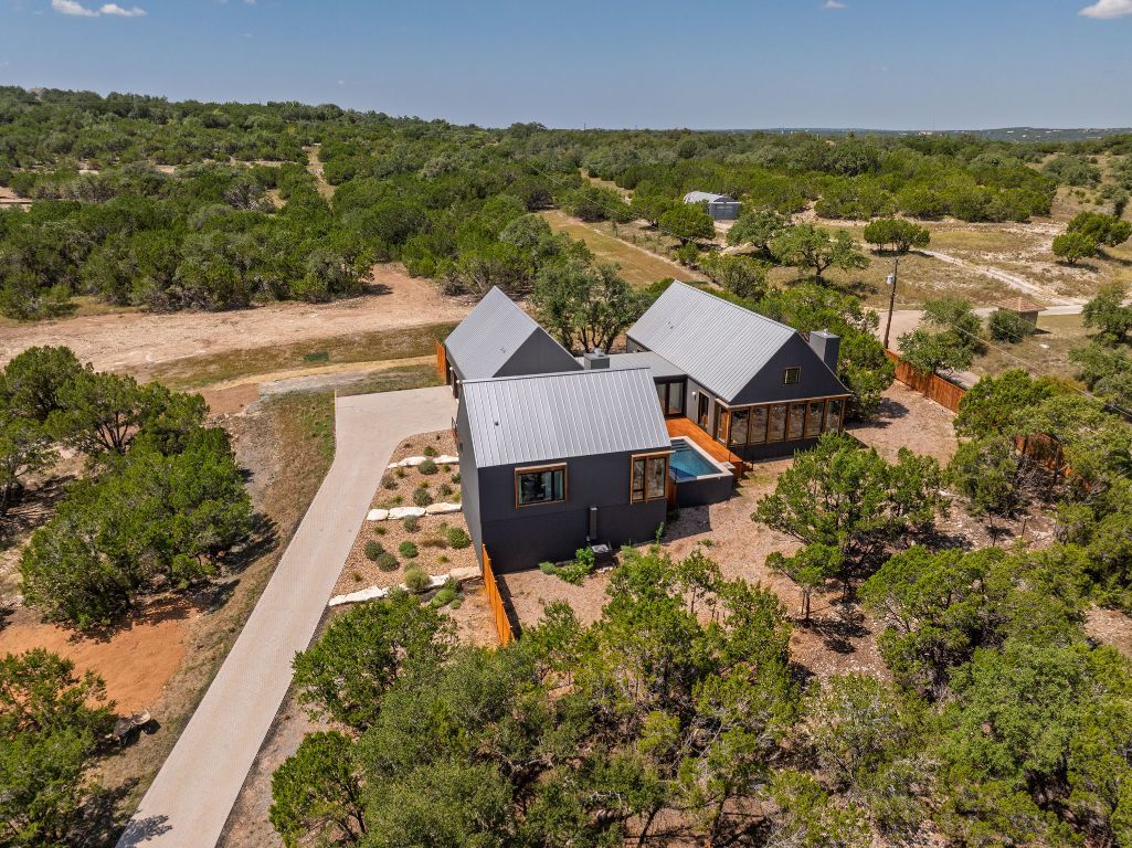 Welcome to this Mid-Century modern home, an impressive example of new construction that beautifully blends contemporary design with classic farmhouse elements. This single-story home features dramatic walls of windows that flood the interior with natural light, complemented by a sophisticated stucco exterior and sleek metal roof. Inside, you'll find four spacious Bedrooms &/0r Study and three and a half Bathrooms arranged in a thoughtful, open floor plan. The property boasts an oversized three-car Garage, providing ample space for vehicles and storage. Step outside to discover a private oasis with a sparkling pool, outdoor fireplace and private yard, perfect for both relaxation and entertaining. Site plan to add Guest House at end of driveway is an optional addition. This exceptional residence is one of just four homes in an exclusive and secluded private enclave, offering the prestige of an Austin address with close access to S. Austin, Belterra and the Fitzhugh corridor, while being served by the highly-rated Dripping Springs schools. Homeowners will appreciate the financial benefits of a low tax rate and connected to MUD water. With no HOA restrictions, you're free to personalize this extraordinary property to your exact preferences, making it truly your own Retreat. Can have 1 horse/1.5 acres. Additional 3 acre parcel can be purchased. Standard Texas Builder Warranty 1-2-10 conveys.