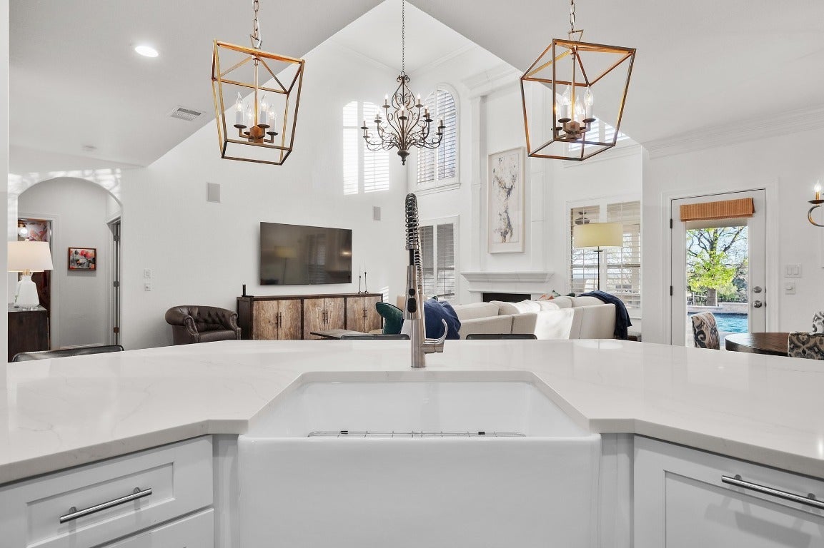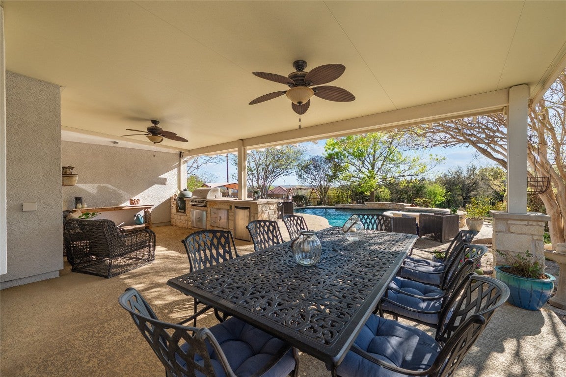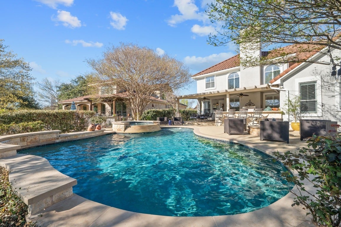 Discover your dream home in the heart of Steiner Ranch, tucked away inside the exclusive gates of the UT Golf Club community. This fully renovated 4 BD/3.5 BA beauty sits on a .28-acre lot. It’s the perfect mix of comfort and laidback luxury. Step inside and you are immediately impressed with the hardwood floors and soaring ceilings that make the whole place feel light, bright, and open. The main level is laid out with a home office, formal dining, and an open kitchen, living and dining space that’s made for entertaining. The living room is stunning with floor-to-ceiling windows that flood the space with natural light—plantation shutter, allow you to control the ambiance. At the center of it all is a kitchen that is sure to channel your inner chef—crisp white quartz atop a massive counter with bar seating, custom cabinetry, walk-in pantry, top of the line SS appliances and even a pot filler over the stovetop. The primary suite is equal parts elegant and functional—tucked away on the main floor for privacy. Inside, you’ll find an ensuite that rivals a day spa. Designed with function in mind, you have vanities along each side of the room, a walk-in shower, and a soaking tub tucked into an arched alcove framed by elegant columns. Upstairs, you’ll find a huge game room, a media room, 3 generous sized bedrooms and two full baths—perfect for family or guests. Then there’s the backyard... It features a covered patio, outdoor kitchen, heated pool and spa, plus a cozy fire pit—all with peaceful greenbelt views. Living in Steiner Ranch isn’t just about the house—it’s about the lifestyle. You’ll have access to the exclusive UT Golf Club, scenic trails, sports courts, lake access with boat ramp, and some of the best schools in the area. All just minutes from shopping, dining, and everything you need. This home is ready for its next chapter—whether it’s quiet mornings by the pool or big, lively gatherings under the stars. It’s time to live the elevated lifestyle you deserve.