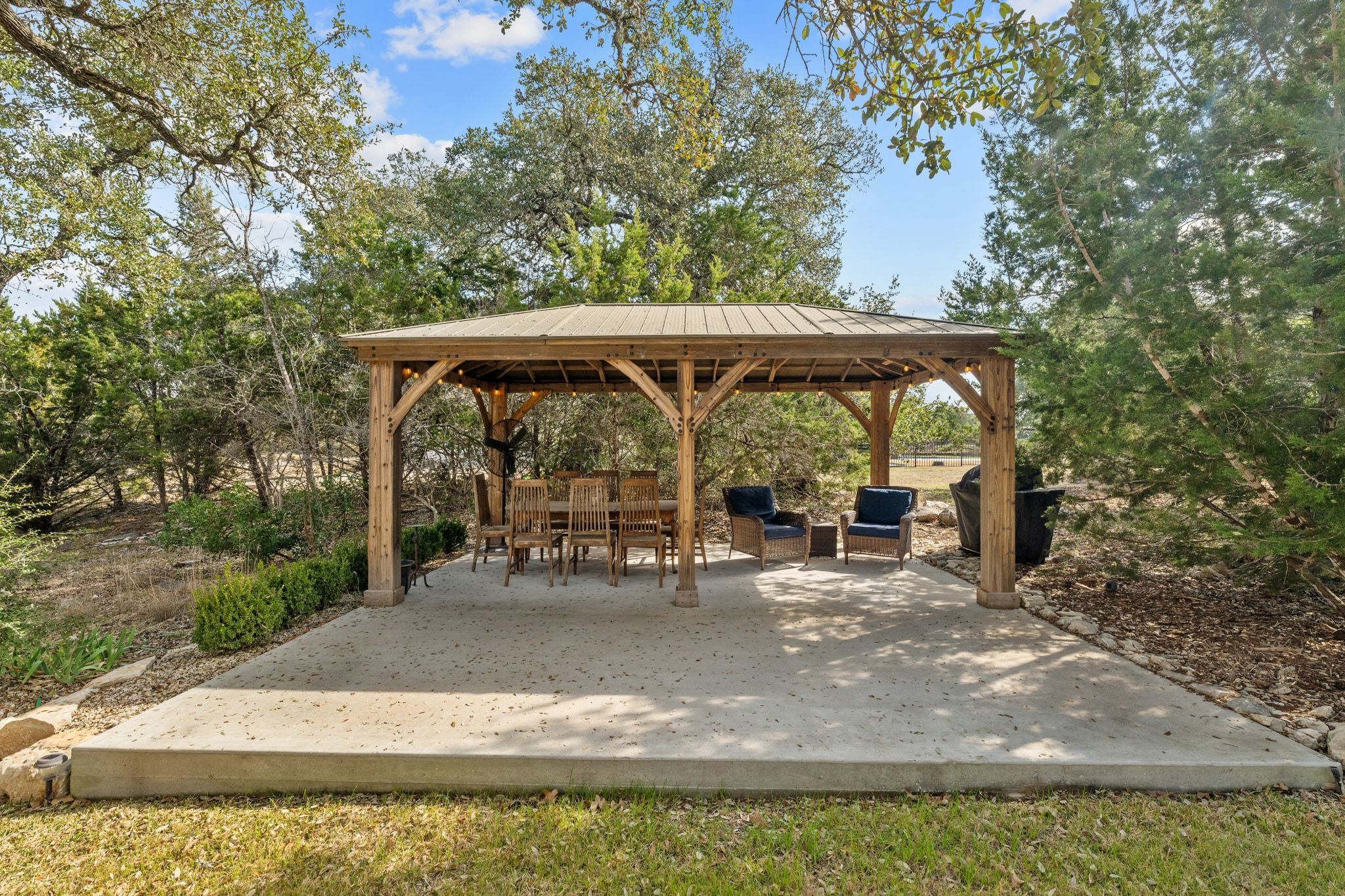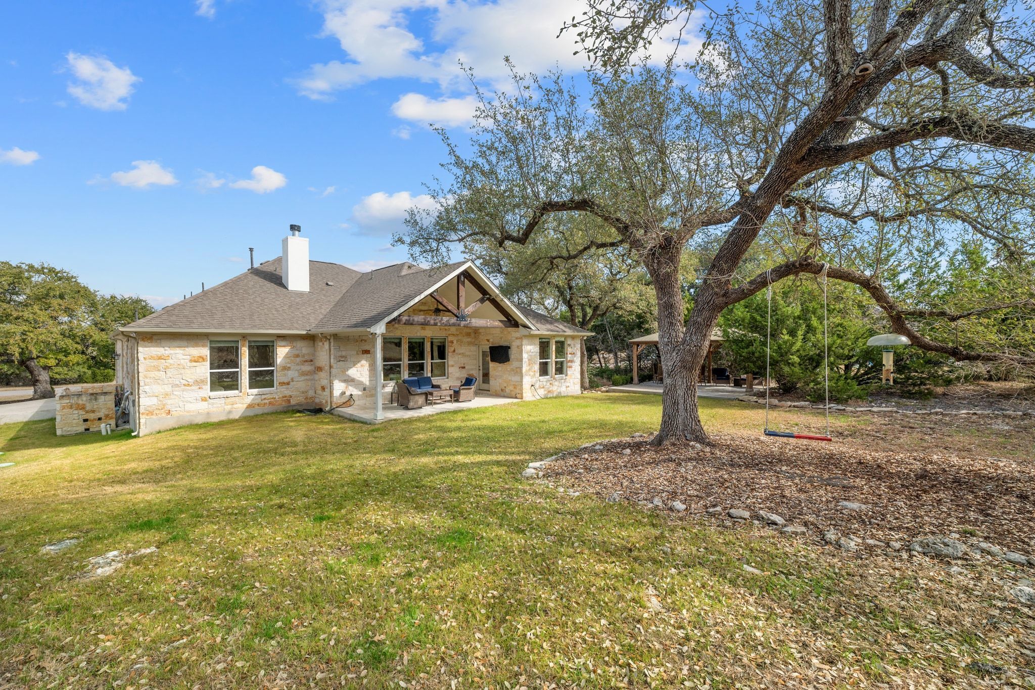 Nestled on a quiet cul-de-sac on approximately 1.5 acres in the highly acclaimed Rim Rock community, this beautifully maintained 3-bedroom, 2.5-bath residence offers an exceptional blend of privacy, space, and refined Hill Country living. A welcoming entry sets the tone, with an oversized executive office to the right and two guest bedrooms with a shared bath to the left. The heart of the home unfolds into an open-concept living space anchored by an Austin stone fireplace with both wood-burning and gas options. The seamless flow into the kitchen and dining area creates an ideal setting for entertaining, featuring granite countertops, generous storage, and inviting gathering spaces designed for everyday living and special occasions alike. The primary suite is a private retreat overlooking the backyard, complete with dual vanities, a soaking tub, walk-in shower, and an expansive walk-in closet with direct access to the laundry room and mud bench for elevated convenience. Outdoors, enjoy peaceful mornings and relaxed evenings on the covered patio, complemented by an additional pergola perfect for grilling and entertaining beneath the Texas sky. With a 1.5% tax rate and Ideally located just 9 miles to Buda and Dripping Springs, 2 miles to The Salt Lick, 10 minutes to shopping and entertainment, and approximately 28 minutes to Downtown Austin and Austin-Bergstrom International Airport. A rare opportunity to enjoy acreage living without sacrificing proximity to the best of the Austin area.
