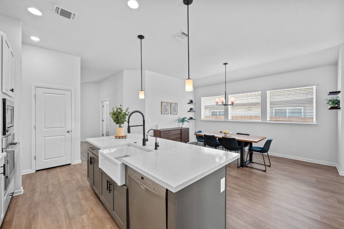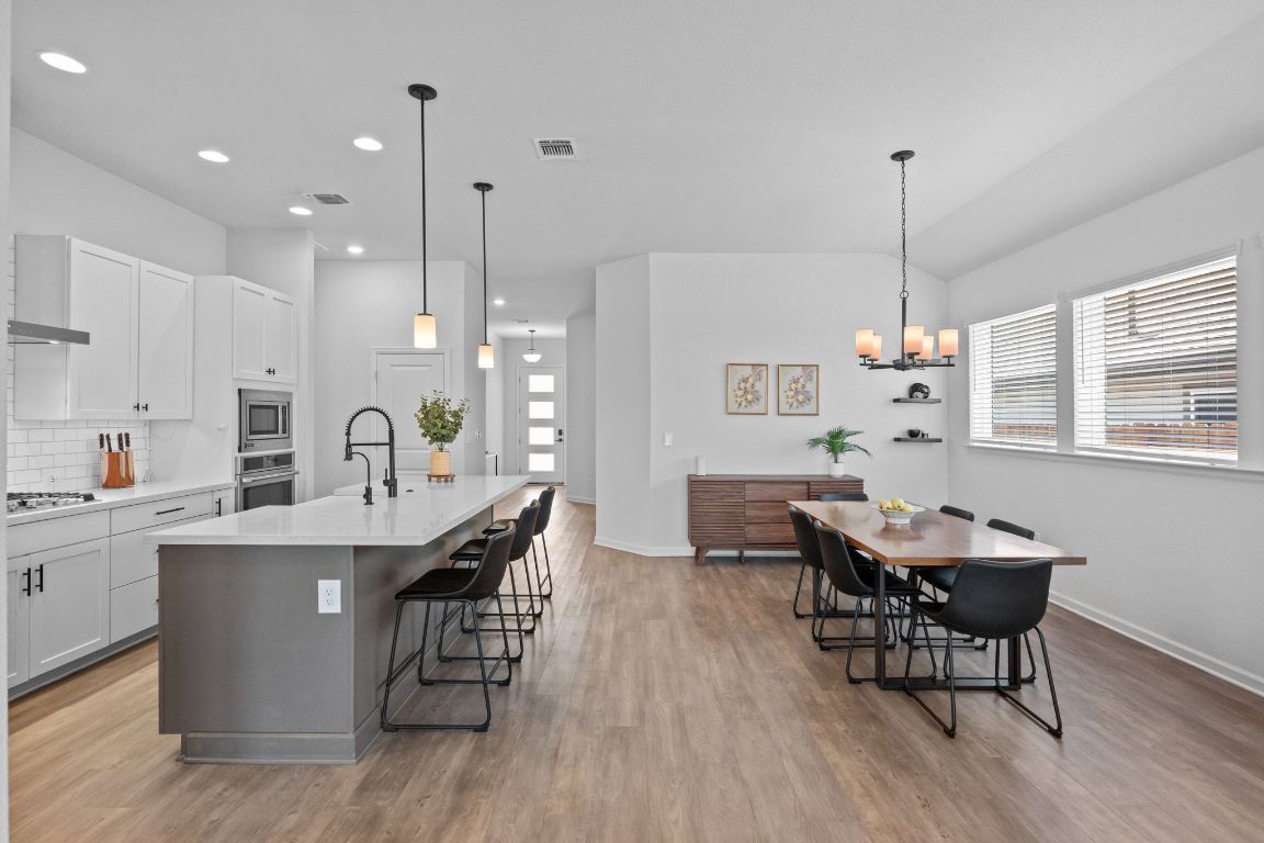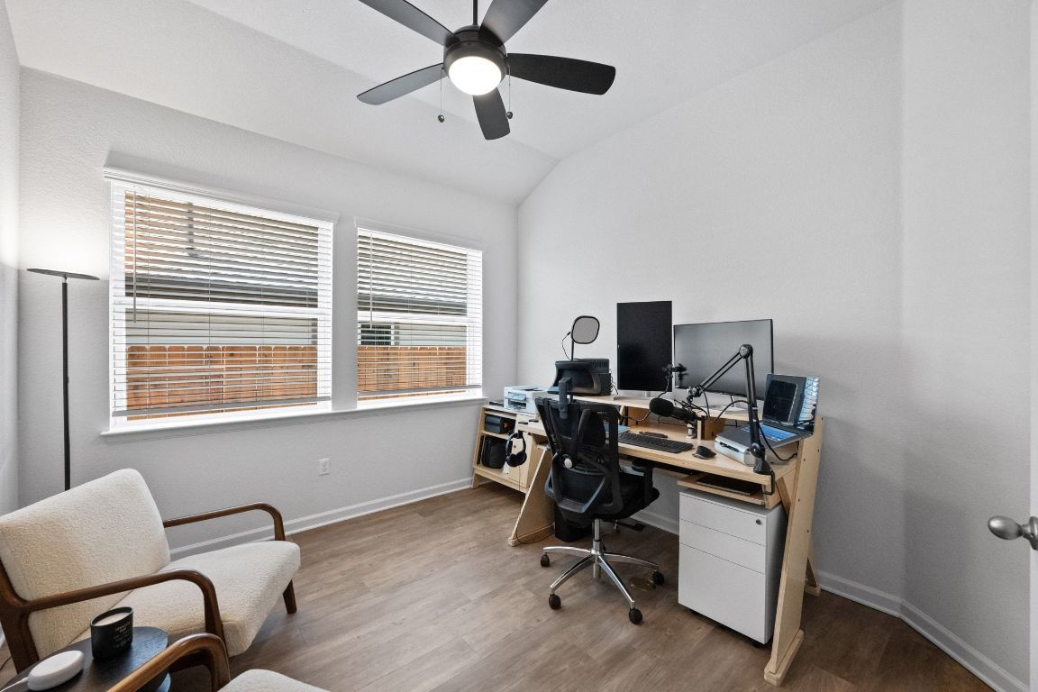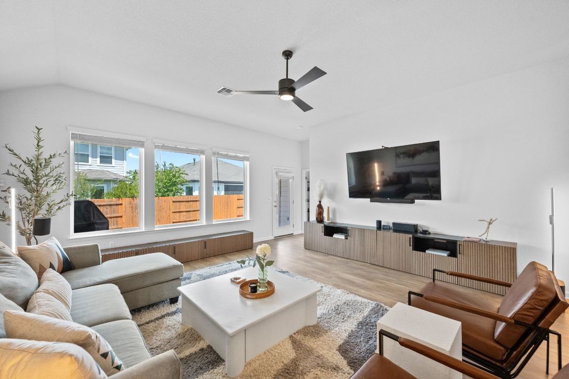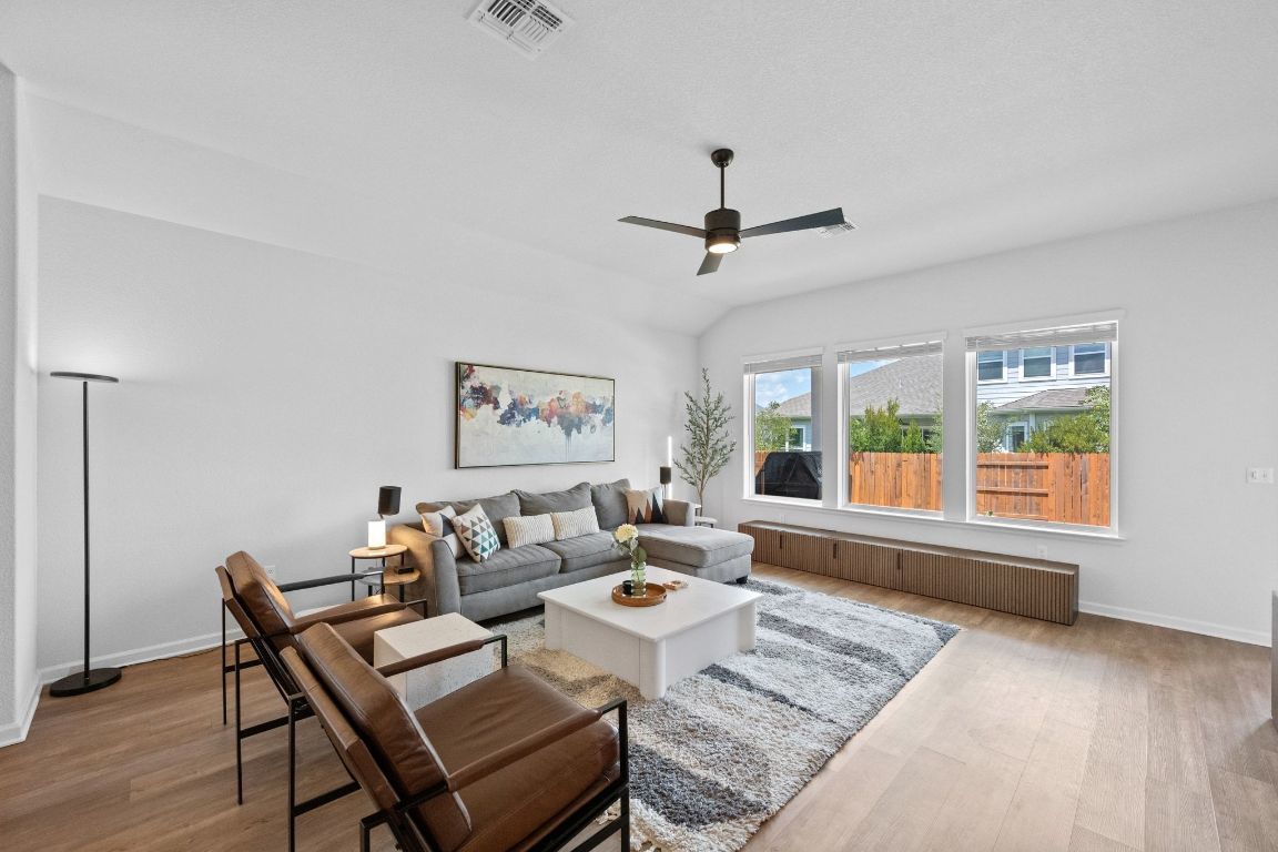 Move-in ready, this upgraded single-story home in Easton Park boasts a 50-foot lot and nearly $60K in design center upgrades. A chef’s kitchen with GE Cafe appliances and a quartz-clad island anchors the open-concept layout. The private, extended owner’s suite features a spa-like super shower, dual vanities, and a generous closet, while three additional bedrooms and a dedicated study/flex space provide flexibility for kids, guests, and your home office. Practical upgrades include a tankless gas water heater, gas stub on the patio, water softener loop, bidet toilets, and structured wiring. Durable luxury vinyl plank flooring spans the main living areas, and native landscaping frames the covered patio and fenced yard. Enjoy Easton Park’s resort-style amenities—clubhouse, pool, parks, trails, and community events—just moments away.