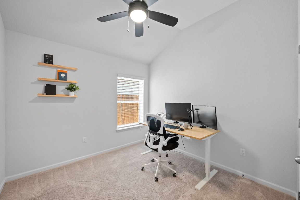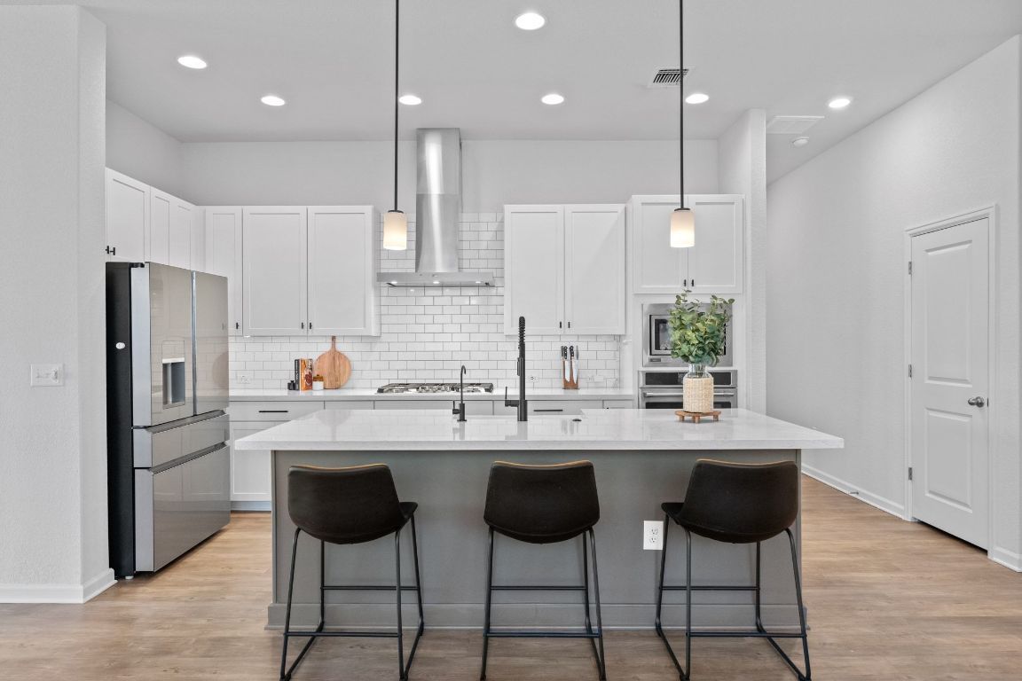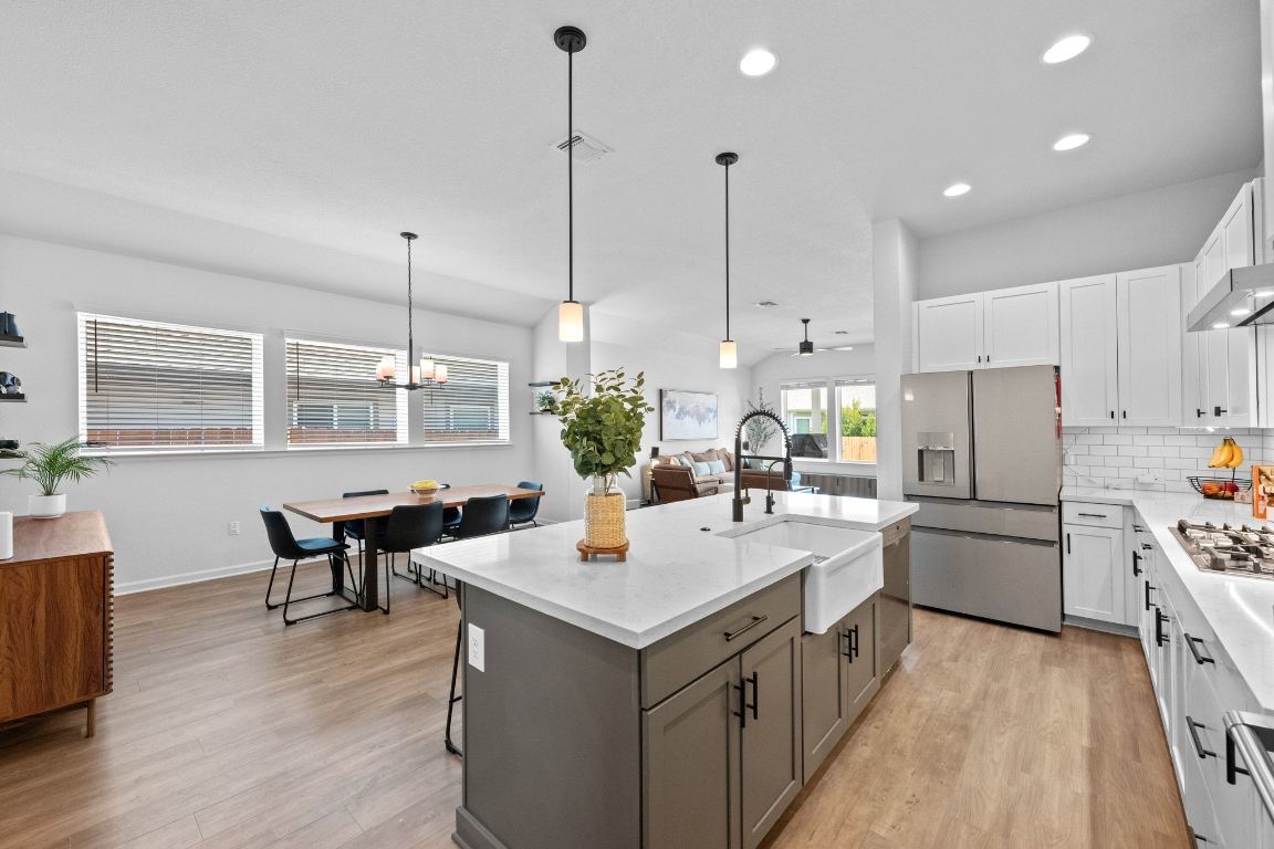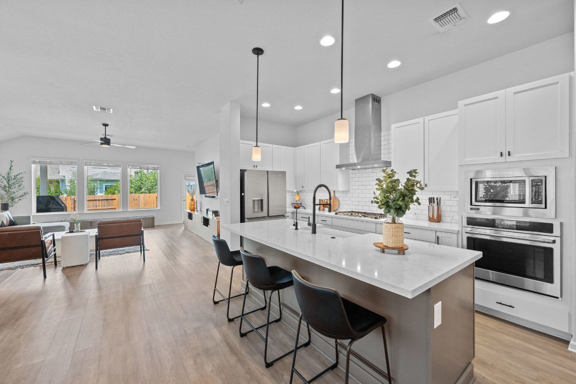 Move-in ready, this upgraded single-story home in Easton Park boasts a 50-foot lot and nearly $60K in design center upgrades. A chef’s kitchen with GE Cafe appliances and a quartz-clad island anchors the open-concept layout. The private, extended owner’s suite features a spa-like super shower, dual vanities, and a generous closet, while three additional bedrooms and a dedicated study/flex space provide flexibility for kids, guests, and your home office. Practical upgrades include a tankless gas water heater, gas stub on the patio, water softener loop, bidet toilets, and structured wiring. Durable luxury vinyl plank flooring spans the main living areas, and native landscaping frames the covered patio and fenced yard. Enjoy Easton Park’s resort-style amenities—clubhouse, pool, parks, trails, and community events—just moments away.