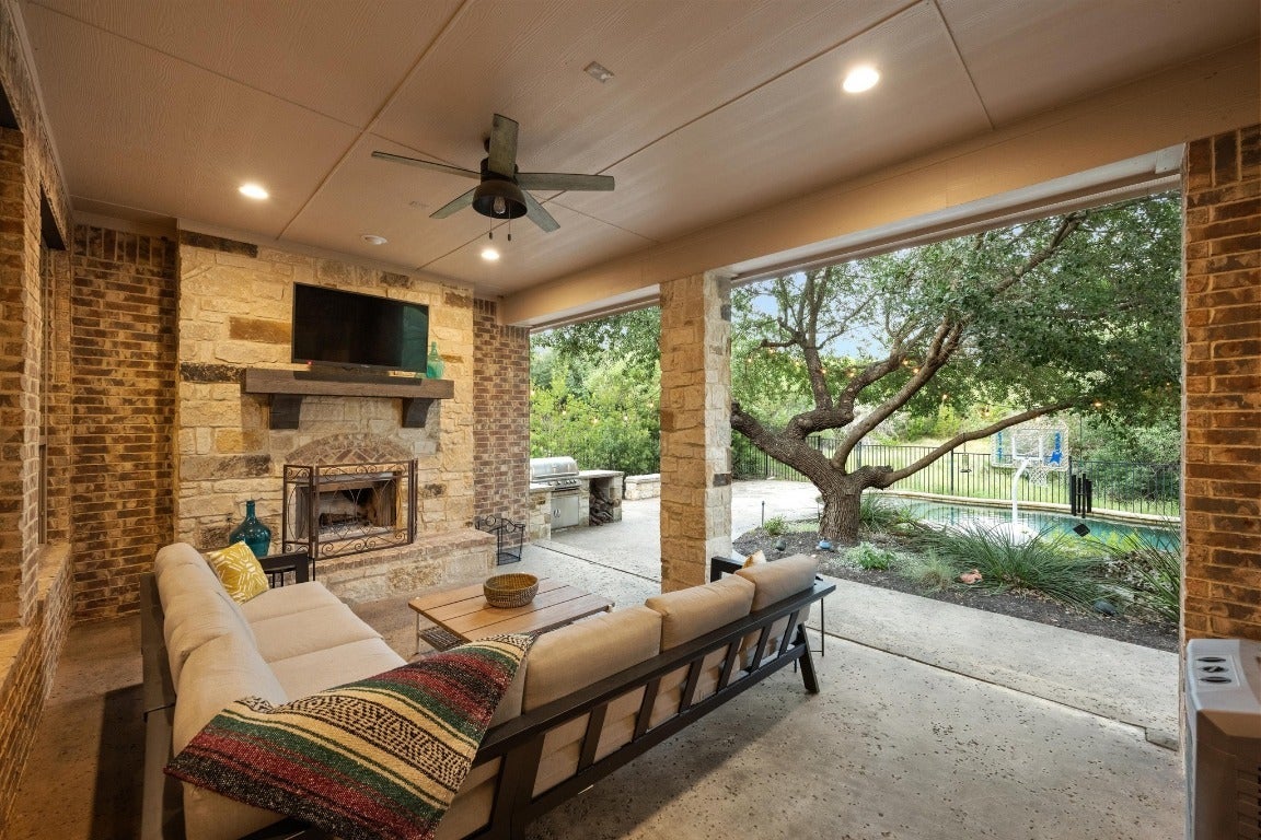 Sophisticated Highland Home with rare & versatile Multi-Generational layout. Situated on a premium greenbelt lot in the highly sought-after Rocky Creek community within acclaimed Lake Travis ISD. This floorplan has a private guest suite & full bath on the main level, in addition to the spacious primary suite retreat. It’s the perfect setup for extended family or visiting guests—offering comfort and privacy with seamless connection to the heart of the home. As you enter through the stately front door, you’re greeted with soft natural light, soaring ceilings, designer lighting, and a bright layout that flows effortlessly from room to room. This floorplan is one of the most sought-after because of the jaw-dropping vaulted ceilings in the family room. You can’t help but walk in and just look up. The floor to ceiling stone fireplace draws your attention all the way to the top where the ceiling is accentuated with wood beams. The chef’s kitchen features exquisite knotty alder cabinetry with high-end vent hood, stainless steel double ovens, built-in gas cooktop, under-cabinet lighting, and an oversized island—ideal for family meals and entertaining. Recently replaced hypo-allergenic wool carpeting upstairs with secondary bedrooms that have their own en-suite bath & a very spacious game/media room. Lushly landscaped backyard with a sparkling pool, covered patio with fireplace, and greenbelt views—perfect for enjoying gentle morning sun and shaded afternoons. Living in Rocky Creek Ranch is the best of both worlds . You get the peaceful, calming setting that you yearn to go home to at the end of a day but also have the convenience of being close into “town”. Approximately only 10 minutes to the Hill Country Galleria for shopping, dining, movies, and grocers like H-E-B or Whole Foods at the Hill Country Galleria. Other updates include: Whole-house surge protector, Tesla charger, Fiber Internet, plantation shutters & recently replaced water heater.