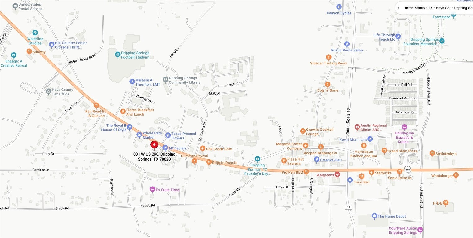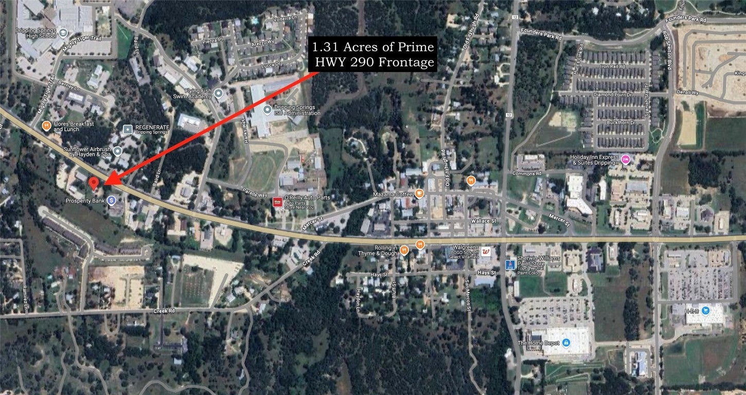 This 1.31 acre commercial lot sits in the heart of the busy and growing Dripping Spring business district. This is an exceptional opportunity for development or investment. Located directly on HWY US 290, the topography provides the perfect canvas for a variety of projects. Its convenient location and great visibility, positions it to capitalize on the area’s growth and expansion. Adjoining 2.97 acre tract also for sale, please inquire within.