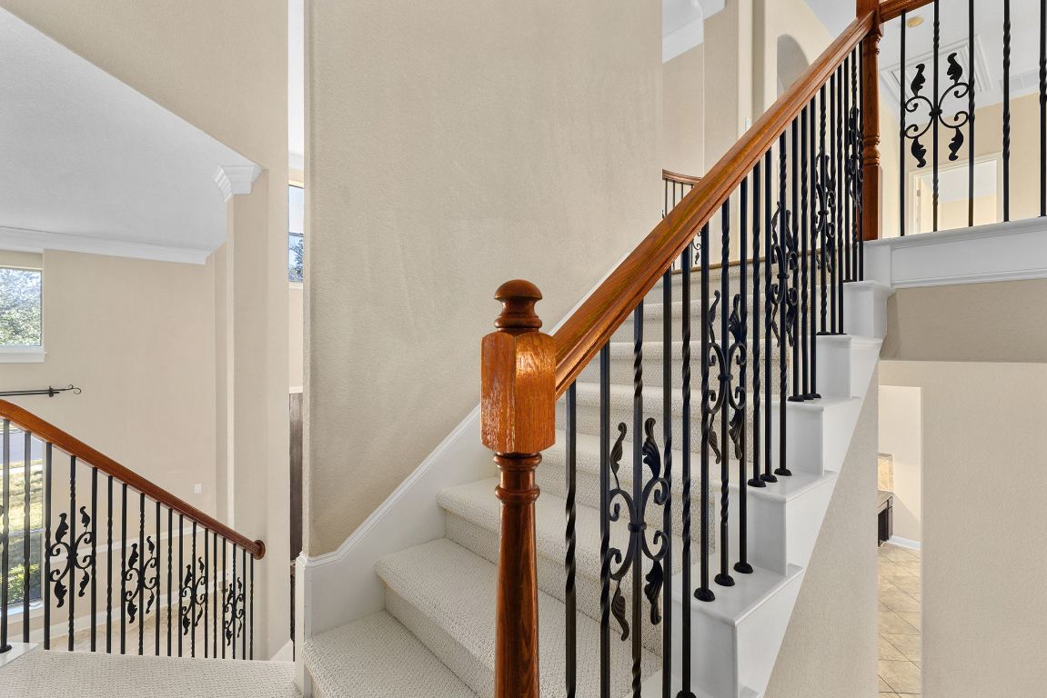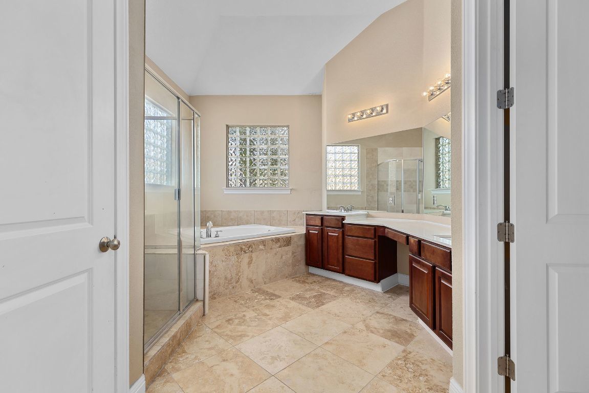 Super rare opportunity in the prestigious Woods section of Forest Creek. This 4,217 sq ft home sits on a .41-acre corner lot at the end of an impressive, quiet cul-de-sac surrounded by custom and executive homes. Built in 2004, this two-story property features 4 bedrooms, 4.5 baths, and a 3-car garage. Designed for comfort and flexibility, it offers ideal space for multi-generational living with a primary suite downstairs and multiple private bedroom options upstairs. The home includes a tile roof with a lifetime warranty, tall cabinetry throughout, and a laundry room with a utility sink. The HVAC system was replaced two years ago. The primary suite features travertine flooring in both the bedroom and bath, along with a garden tub and separate shower. Upstairs, one bedroom has a private bath, while two others share a Jack and Jill layout—perfect for family or guests. The Woods section of Forest Creek is highly sought after for its large homesites, mature trees, and quiet atmosphere. Forest Creek residents enjoy access to the community golf course, walking trails, and nearby schools, parks, and shopping. This location provides excellent access to major employers including Tesla, Samsung, and Emerson, as well as a growing list of local restaurants and retail centers in Round Rock and Pflugerville. A rare combination of space, quality, and location—this home is perfect for those seeking flexibility, privacy, and the convenience of one of Round Rock’s most desirable neighborhoods. All information is deemed reliable. Buyers to verify all information.