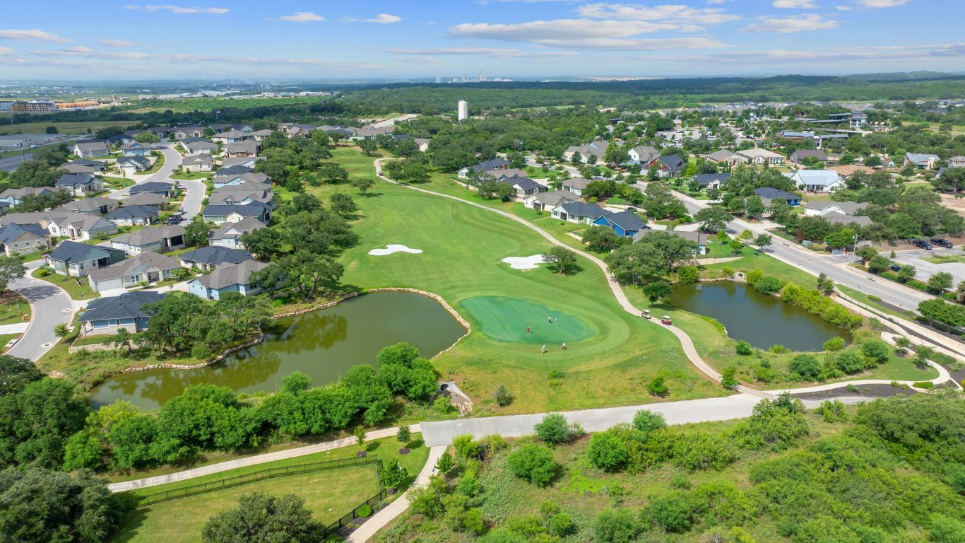 Meticulously maintained 2 bedroom/2 bathroom home nestled on a coveted quiet interior lot that backs to greenspace. The open concept layout is great for entertaining/having guests over. The kitchen has barely used stainless steel appliance and beautiful granite counters and large kitchen island, overlooks the dining and living that opens up to the covered back patio. The bedrooms are separated by the main living space, allowing for maximum privacy for the master suite. The primary bedroom overlooking the private back yard/green space has high ceilings, ceiling fan and a large walk-in closet. The master bathroom has dual sinks, granite counter and a huge walk-in glass shower. A bonus nook is the perfect space for a small desk, office space or reading chair. Kissing tree, a gated 55+ community, offers an array of top-tier amenities including an Audubon-rated 18 hole golf course, pool and spa, resort activities, an on-site restaurant and bar, sport courts, pickleball courts, fitness center with classes, trails, activities and so much more. Situated between Austin and San Antonio, as well as the hill country wineries.
