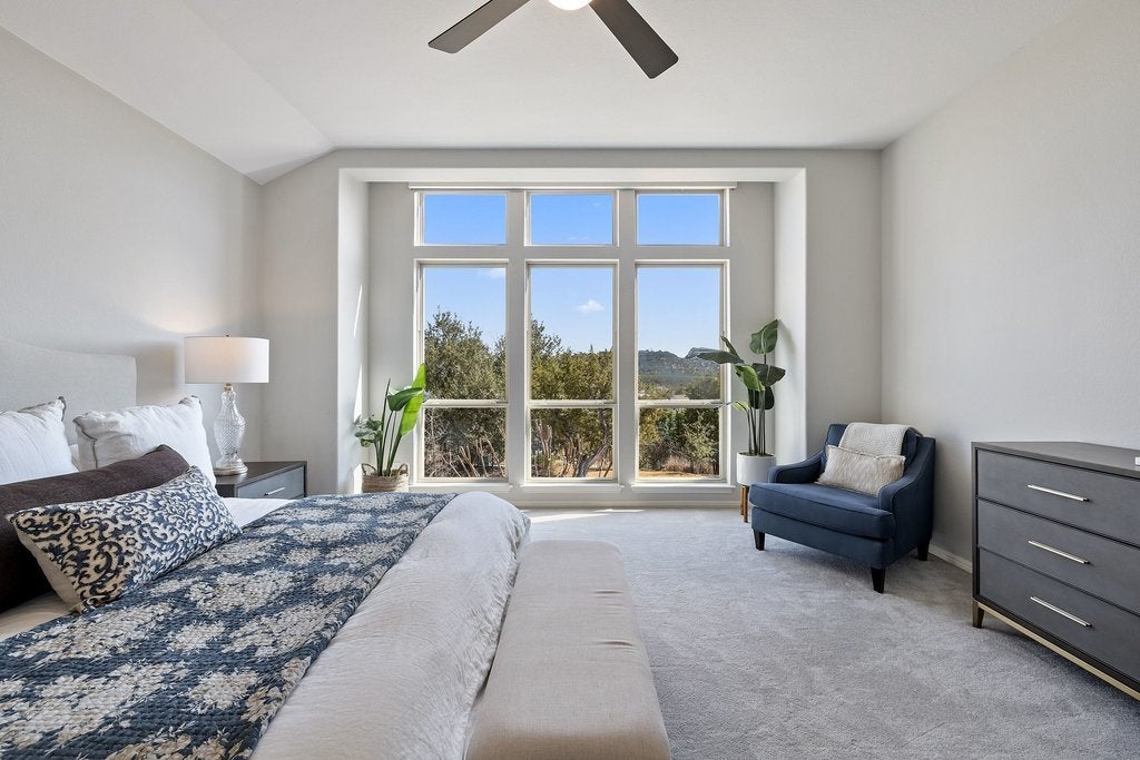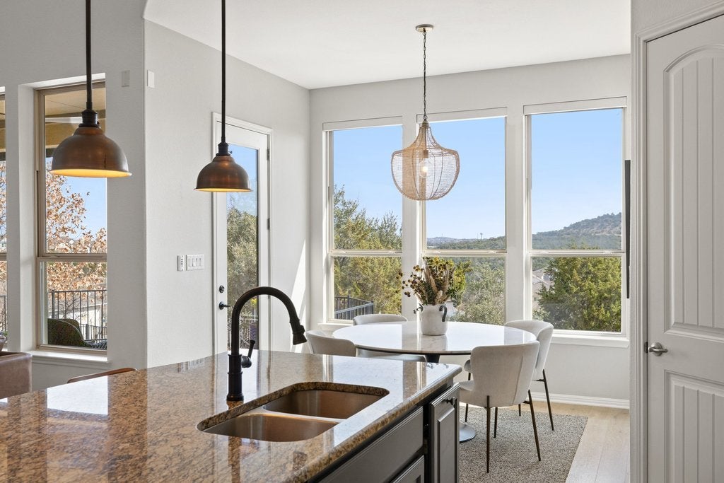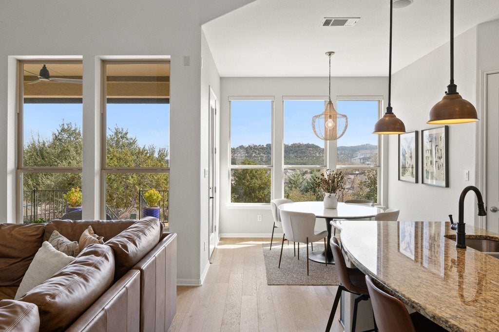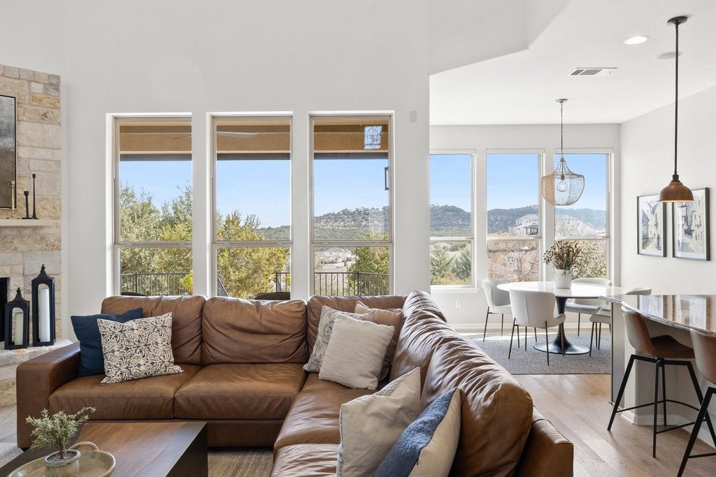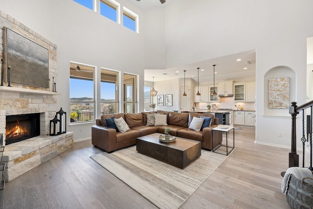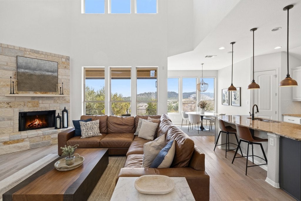 Hill Country views. Main-floor primary bedroom. Mother-in-law floor plan with only one step to enter! Welcome to 405 Baldovino Skyway in the heart of Rough Hollow. Thoughtfully designed and beautifully appointed, this 5-bedroom home plus dedicated office, with one bedroom currently used as a secondary office, offers 3.5 baths and nearly 4,000 square feet of refined living space filled with natural light, architectural detail, and sweeping vistas that define Lakeway living. The main level blends comfort and sophistication, featuring a serene primary suite and a private mother-in-law suite with full bath and walk-in closet, creating effortless flexibility for guests or extended family. A dedicated office provides a polished work-from-home setting without sacrificing bedrooms. The open-concept kitchen, dining, and living spaces are framed by expansive windows and soaring ceilings, creating an airy, elevated atmosphere that feels both grand and welcoming. Every gathering is set against the backdrop of rolling Hill Country views. Premium automatic shades for the primary bedroom are just some of the elevated finishes you'll find in this home. Upstairs, an expansive bonus living area with wet bar offers a refined retreat for media nights, entertaining, or relaxed evenings at home. Step outside and take in the views. The backyard offers ample space to design a custom pool overlooking the hills, creating the opportunity for a private resort-style escape tailored to your vision. Covered patio with automatic screens allow you to enjoy your outdoor space all year round regardless of the temperature! Living in Rough Hollow means access to premier amenities including multiple pools, splash areas, fitness facilities, hike and bike trails, tennis and sport courts, community events, and the Rough Hollow Yacht Club and Marina with Lake Travis access. Scenic. Elevated. Effortlessly functional. This is Lakeway living at its finest.