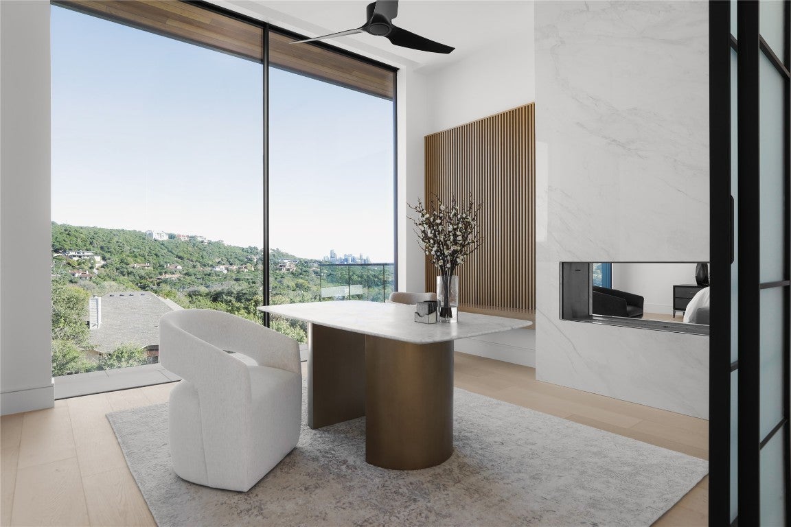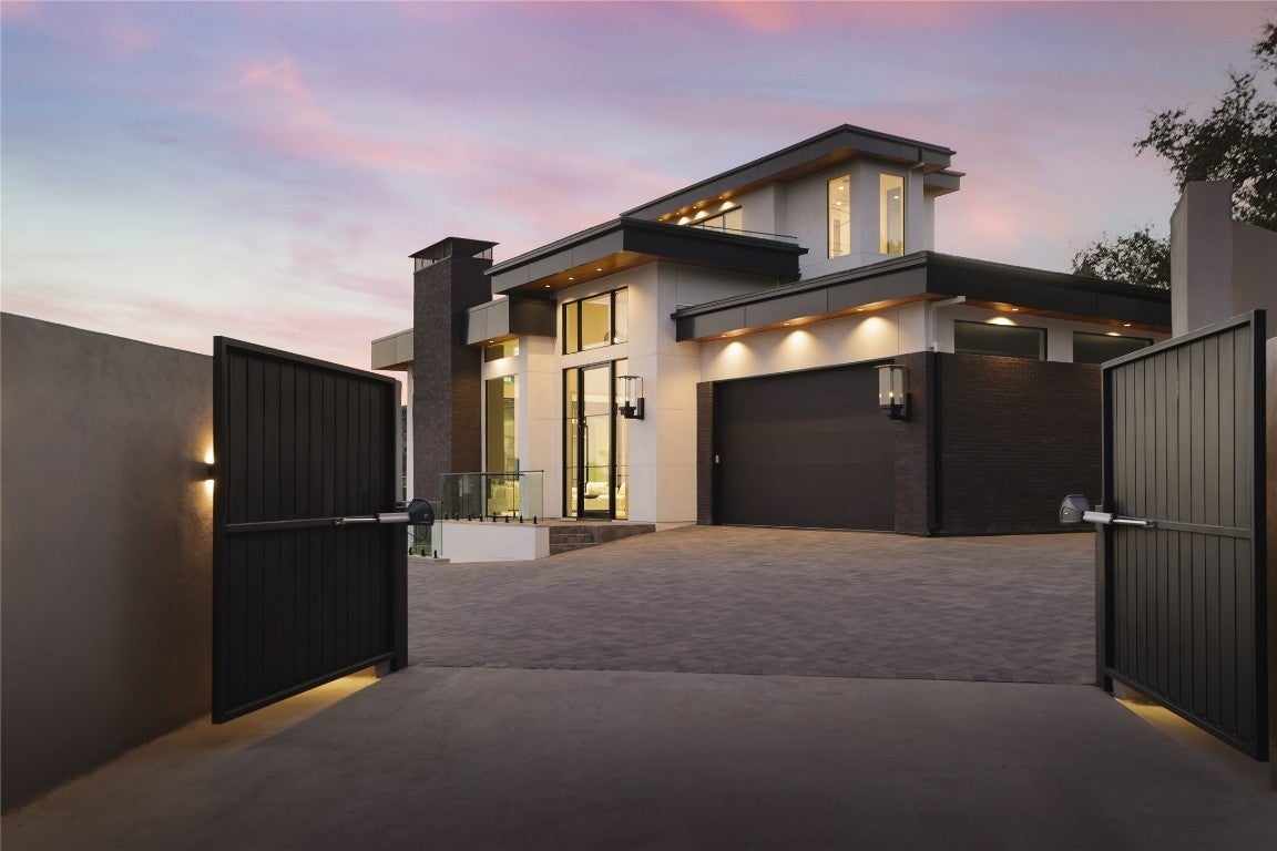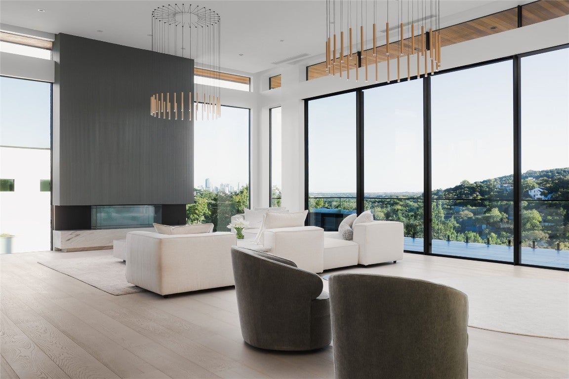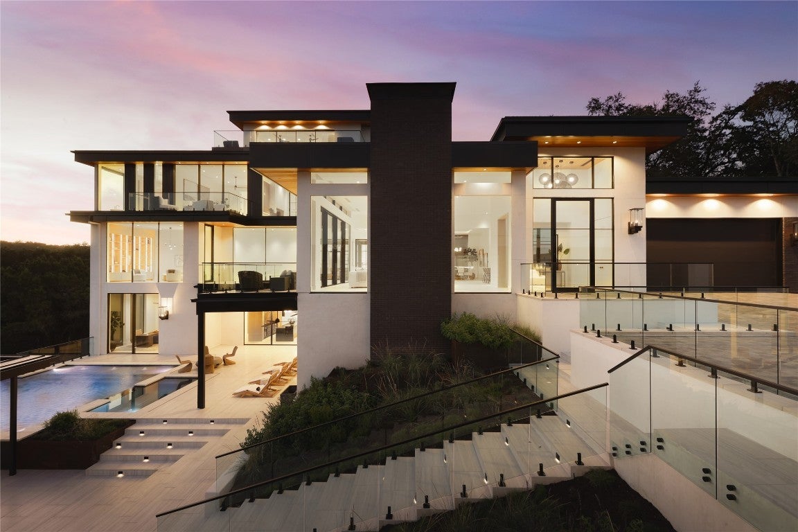 Newly completed, The Onyx is among the most significant residential offerings ever brought to market in Westlake Hills. Defined by rare elevation, sweeping downtown Austin views, and exceptional execution, this architectural estate delivers scale, presence, and privacy at a level few homes achieve. A secure, gated, and privately walled arrival sets the tone for the residence. Spanning approximately 11,000 square feet on nearly an acre, the home was built by Paradisa Homes with an uncompromising focus on proportion, durability, and enduring quality. Walls of glass frame the living environment throughout, including a custom Fleetwood Edge sliding system—the largest of its kind—opening to uninterrupted city and Hill Country views. Interior volumes are striking, with ceilings reaching up to 18 feet and light moving intentionally throughout the day. The kitchen is anchored by a 12-foot Milano marble island with Gaggenau appliances, complemented by a fully equipped catering kitchen with Thermador appliances and a glass-enclosed wine vault with approximately 600-bottle capacity. An entire level is dedicated to the owner’s suite, featuring a private lounge, office, dual walk-in closets, safe room, and a spa-like bath with soaking tub, oversized rain shower, and floor-to-ceiling glass framing downtown views. Additional amenities include a private theater, fitness studio with steam shower, library, full bar opening to the pool, elevator, and a fourth-floor Sky Parlor designed for indoor-outdoor entertaining. Outdoor living includes a resort-style pool and spa, cabana with swim-up bar, outdoor kitchen, pool bath, and expansive lawns. A detached guest house offers a kitchen, living space, and en-suite bedroom. Garage parking accommodates 6–12 vehicles with lift capability. Located in Eanes ISD and minutes from downtown Austin.