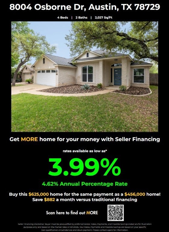 Lender backed Seller's Financing available as low as 3.99% https://moresellerfinancing.com/buyer-landing-page/ $600,000 offered when using the lender backed financing option! Welcome to 8004 Osborne Dr, a one-story ranch gem nestled in 78729. This home has four spacious bedrooms. Or three and a dedicated office space. Step into an open floor plan that seamlessly connects the living room, dining area, and a chef’s dream kitchen. The kitchen showcases a sub-zero fridge, wine fridge, and a large island with soft-close drawers and cabinets—perfect for those who love to cook and entertain. Just outside, enjoy an enclosed, temp-controlled patio. Need to work from home or looking for extra space? A flex room can serve as an office or the 4th bedroom to fit your lifestyle. The living room’s open layout lets you entertain and prepare a feast without missing quality time. A fireplace creates a warm, inviting atmosphere for chilly Texas nights (hey, they happen!). Built-in seating and a buffet with storage add functionality. The primary bedroom features a sliding door exit to the patio—perfect for morning coffee or winding down at night. In the garage-an EV charger, tucked on the side of the house, raised garden beds, and remote-controlled blinds for comfort and convenience. Adjacent 2-story, 4 bedroom home at 8001 Rimini Trail also for sale—ideal for multi-gen living or friends. Combined yards create a rare, expansive backyard retreat. This community fosters a supportive neighborhood vibe. Nearby parks offer pools, tennis, and trails. Close to major employers and highways for easy access to all Austin has to offer. Surrounded by large trees, 8004 Osborne Dr is more than a home—it’s a sanctuary where modern amenities meet timeless charm. Don’t have an agent? CALL ME! Let’s go see it!