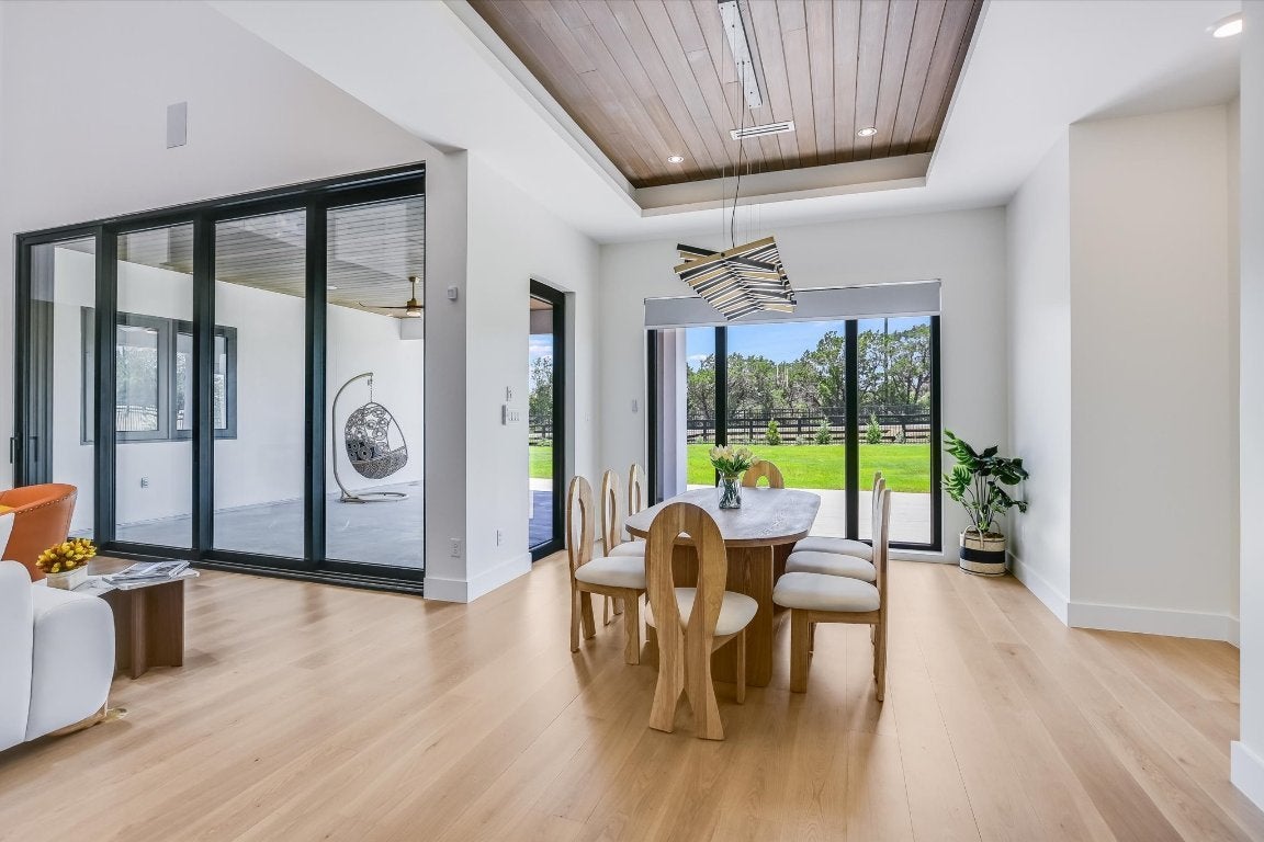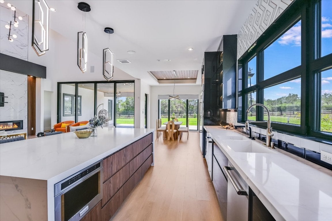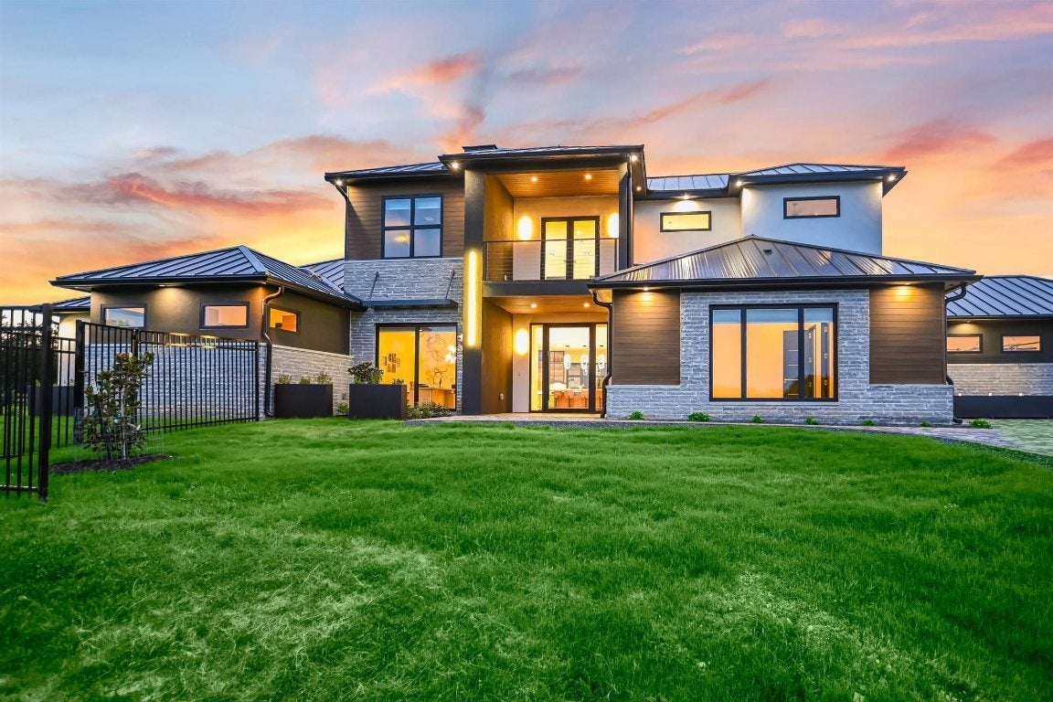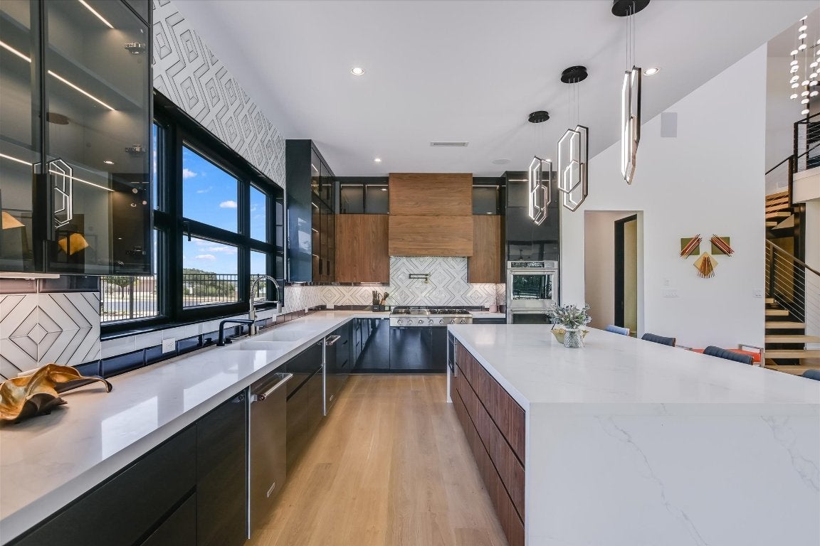 Stunning recently constructed and may be sold as furnished with carefully selected modern furnishings! Energy Efficient modern home with high end options in 24/7 guard gated golf community in Spicewood TX - This stunning home features a metal standing seam roof, fountain, back entry aluminum glass garage doors, epoxy garage floors and is located at the corner of Lauren Dr and Lauren Ct in the Barton Creek Lakeside community. Gorgeous see-through fireplace serving both the living room and the study. Storage is abundant in the home with both a huge pantry and a huge laundry room with lots of cabinetry. Note the exceptional open floor plan, the "floating" stairs, Living room ceiling detail with modern lighting, european white oak hardwood flooring, European cabinets, waterfall island, Custom solid wood interior doors, Huge multi-sliding living room door, motorized blinds, paver driveways, Kitchenaid 48" Appliance package, and Custom primary closet. This large lot is perfect for adding a pool. Barton Creek Lakeside Club has wonderful amenities including both casual and fine dining, 18 hole Arnold Palmer designed golf course, Olympic sized pool, fitness center as well as tennis and paddleball courts. There is also a community boat ramp and privately owned marina with leased boat slips!
