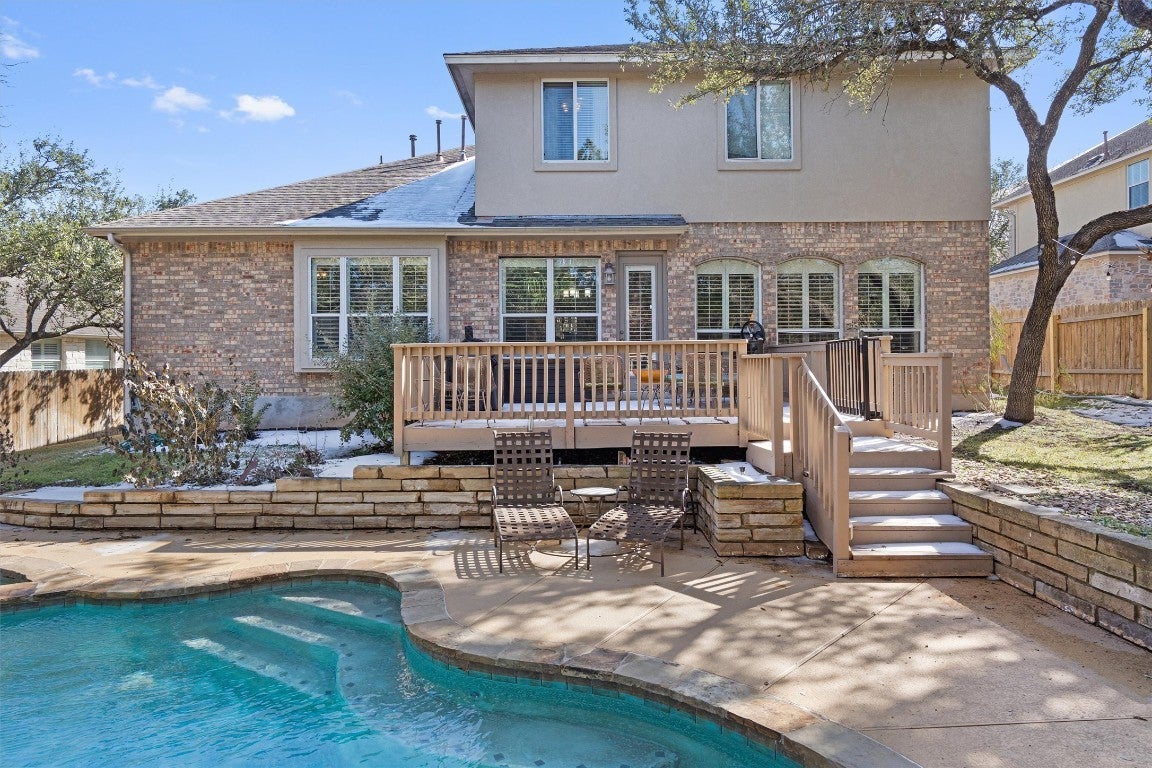 Welcome to your private oasis on a greenbelt lot! This beautifully updated home offers interior designer touches throughout, featuring curated finishes, elegant lighting, and a warm, modern aesthetic in every space. The custom pool / hot tub combo with a large deck and private backyard are perfect for entertaining, and there is a 5-acre greenbelt behind the home as well as no neighbors to the left. The home boasts an open layout with tons of space with the newly renovated kitchen and powder bath with the primary bedroom on the main floor along with an office, dining room and additional flex space. The upstairs has an additional flex space and 3 bedrooms and 2 bathrooms. The kitchen was very recently remodeled and is freshly painted. Schedule a tour and come take a look!