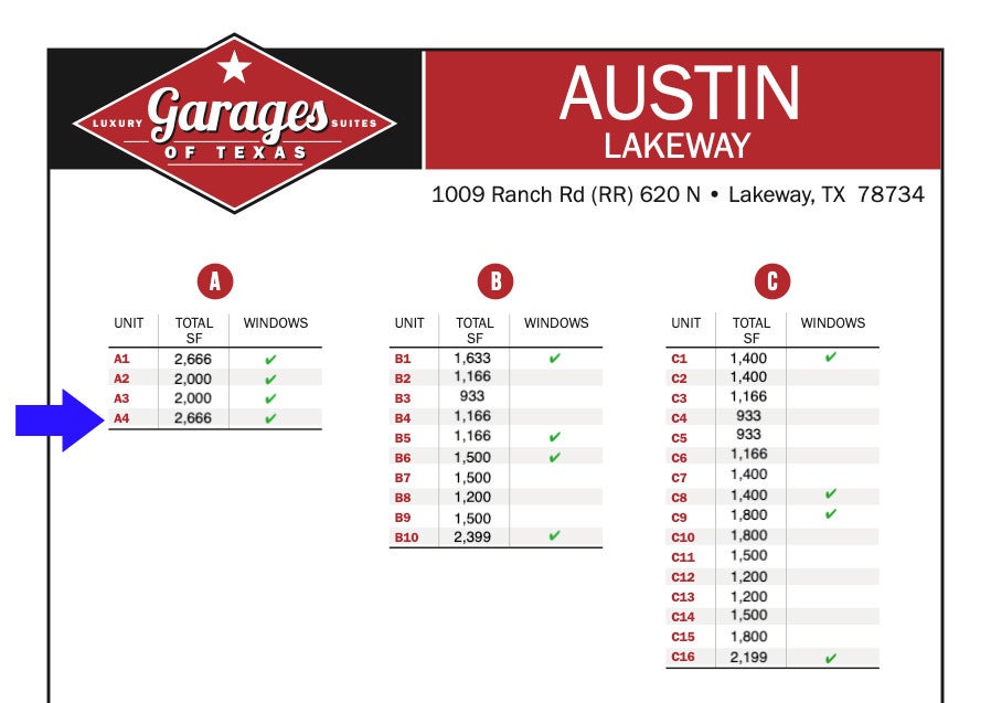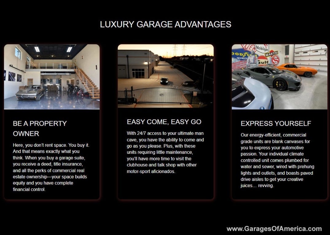 Fuel your motorsport passions and design your own showcar / boat / motorhome garage! Unit 104 is one of the largest luxury garage suites at Garages of Texas and one of the few that accomodates a full length motorhome or tour bus. Dimensions are approximately 50' depth x 40' width with a +/- 660sf mezzanine / loft. Commercial construction, state of the art security and ready for customization to any level you desire! Gated entry for owners allows 24/7 access and security while the common space lounge facilities allow owners to mingle and entertain guests. Build-out options include automobile lifts, living areas, bar, full bath, kitchen, laundry room, your imagination is the limit! Search Luxury Garage Suites to find inspiration for your build! Also listed FOR SALE.