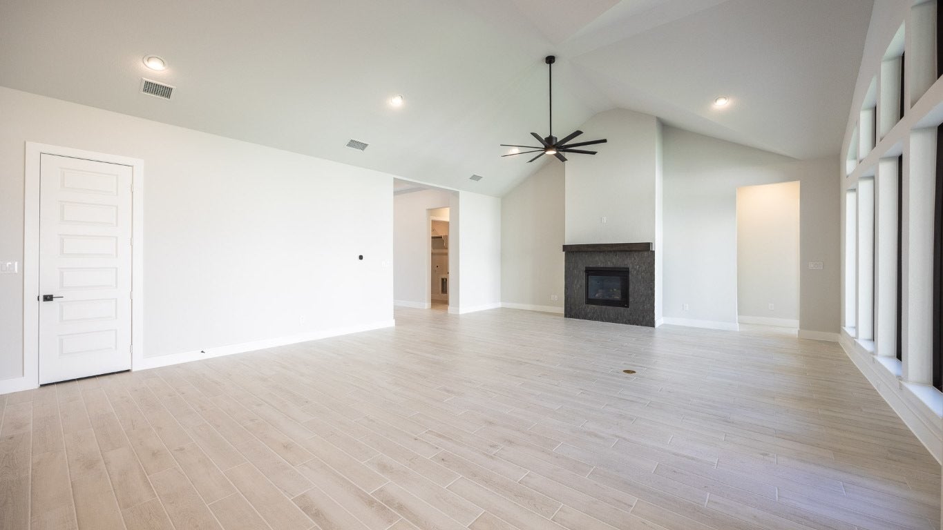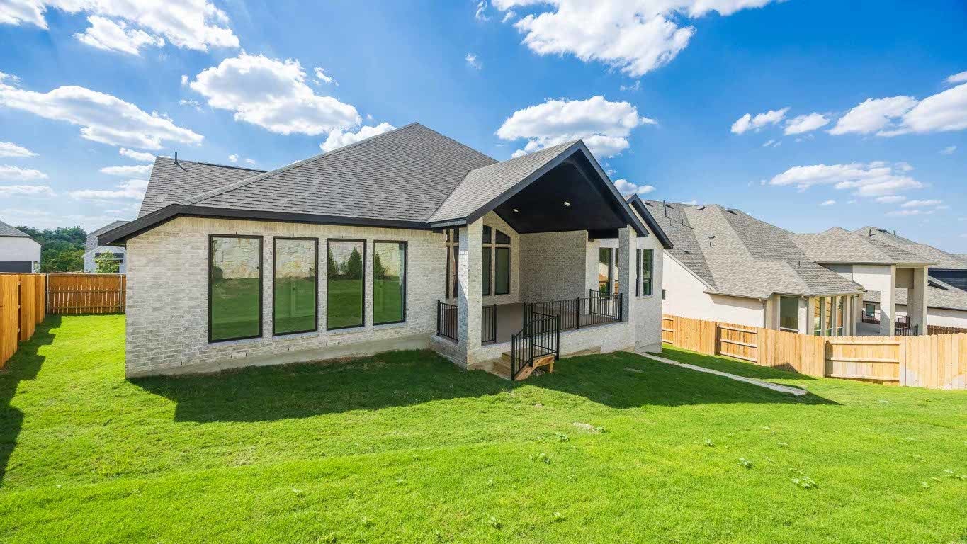 READY FOR MOVE-IN! Home office with French doors set at entry with 12-foot ceiling. Extended entry leads to open family room, dining area and kitchen with 16-foot ceilings throughout. Family room features a wood mantel fireplace and wall of windows. Kitchen features walk-in pantry, generous counter space, 5-burner gas cooktop and oversized island with built-in seating space. Game room with wall of windows just off dining area. Primary suite includes bedroom with wall of windows. Primary bath features 11-foot ceiling, dual vanities, freestanding tub, separate glass-enclosed shower and two walk-in closets. A Hollywood bath adds to this spacious four-bedroom home. Extended covered backyard patio with 16-foot ceiling. Mud room off three car-garage.