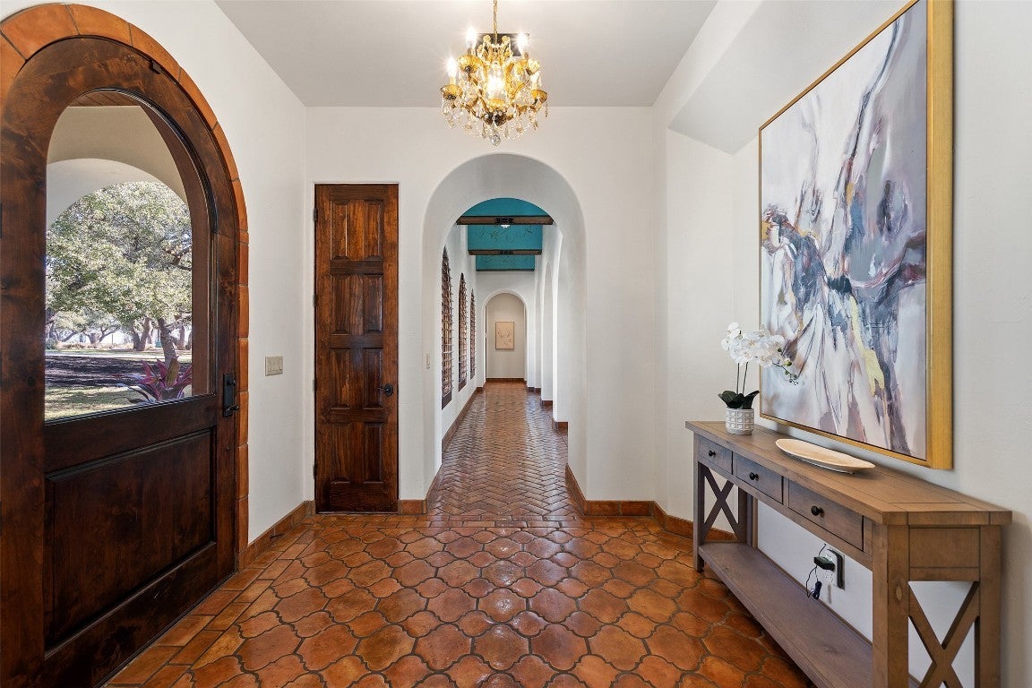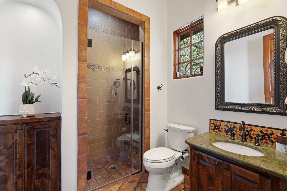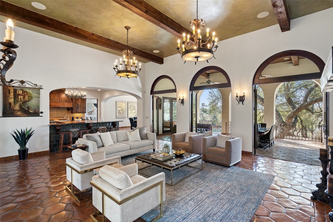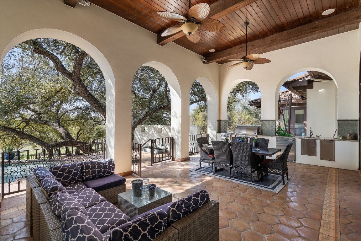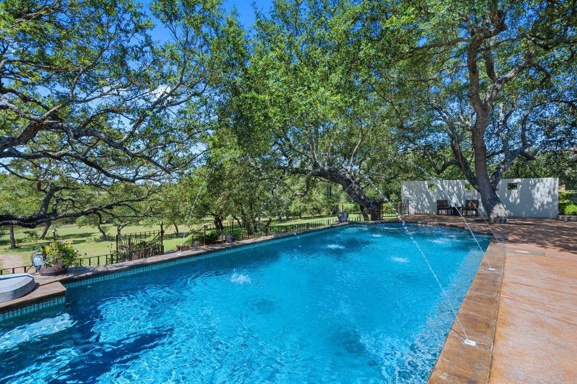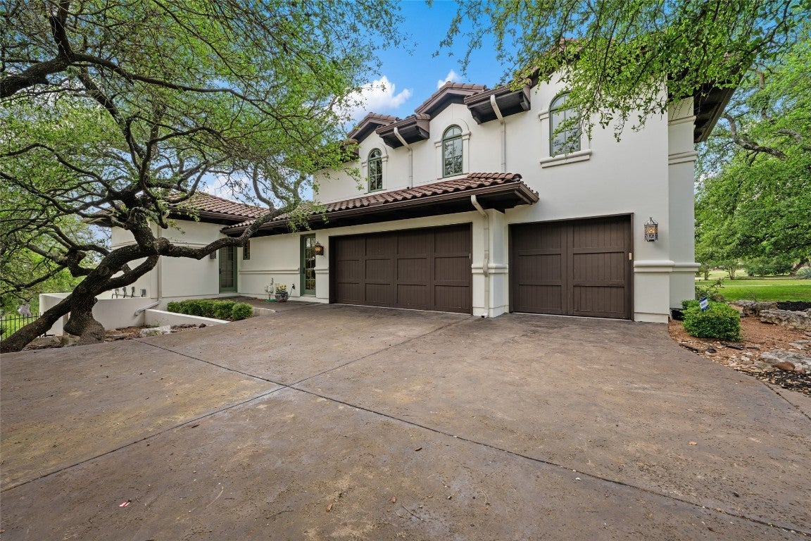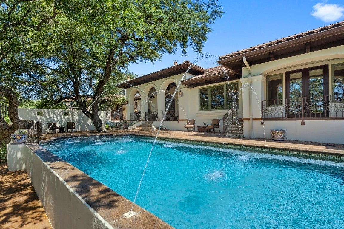 Substantial Price Improvement! Discover the epitome of luxury living in this stunning Santa Barbara-style estate, where every detail showcases exceptional craftsmanship. Elegant features such as knotty alder doors, custom tile work, and unique light fixtures highlight the thoughtful design throughout. The chef's kitchen is a culinary dream, equipped with Viking appliances, including a 48” cooktop, ice maker, warming drawer, built-in refrigerator, and a commercial-grade water treatment system. Enjoy the convenience of an oversized pantry, an additional refrigerator, a spacious utility room, and generous built-in cabinets. The dining room is a bright, inviting space, accentuated by picture windows and a wood tray ceiling. The primary bedroom is your personal retreat, with an adobe-style fireplace, wood tray ceiling, and an expansive sitting area featuring a hand-painted ceiling. The primary bathroom is completed with a jetted tub, dual vanities, walk-in shower, and two large walk-in closets. The main living area captivates with custom tile work around the fireplace, dual chandeliers, a wet bar, ice maker, beamed ceilings, and French doors opening to a covered patio. The additional family room on the lower level offers a built-in Captivate Audio entertainment system and a high-tech video security system. The upstairs media room features a kitchenette with ice maker and a full bathroom, great for entertaining. The upper-level wing includes three ensuite bedrooms, a study area, and a second washer/dryer set, while the lower-level guest room offers privacy with its own entrance and patio access. Outside, enjoy a private pool, sport court, playground, and firepit, creating a perfect outdoor sanctuary. This property is located in the acclaimed Lake Travis ISD school district and has a low tax rate of 1.76%. The community amenities include a lazy river pool, splash pad, fishing pond, 80 acre nature preserve, playscape, sport court, community center, and social events.