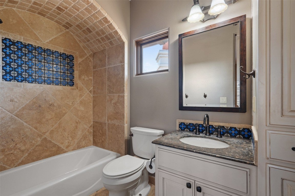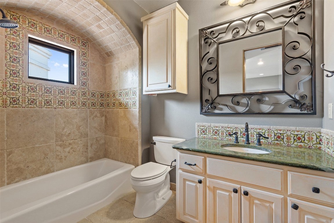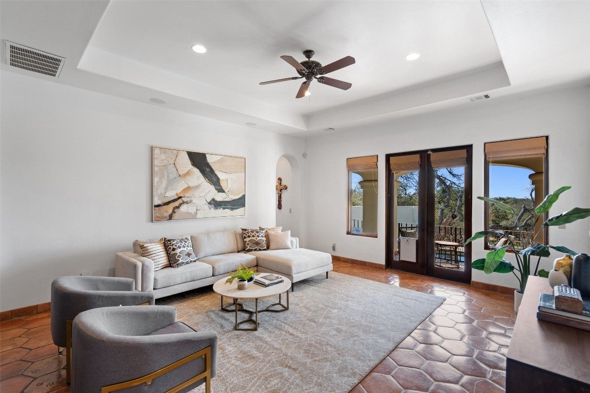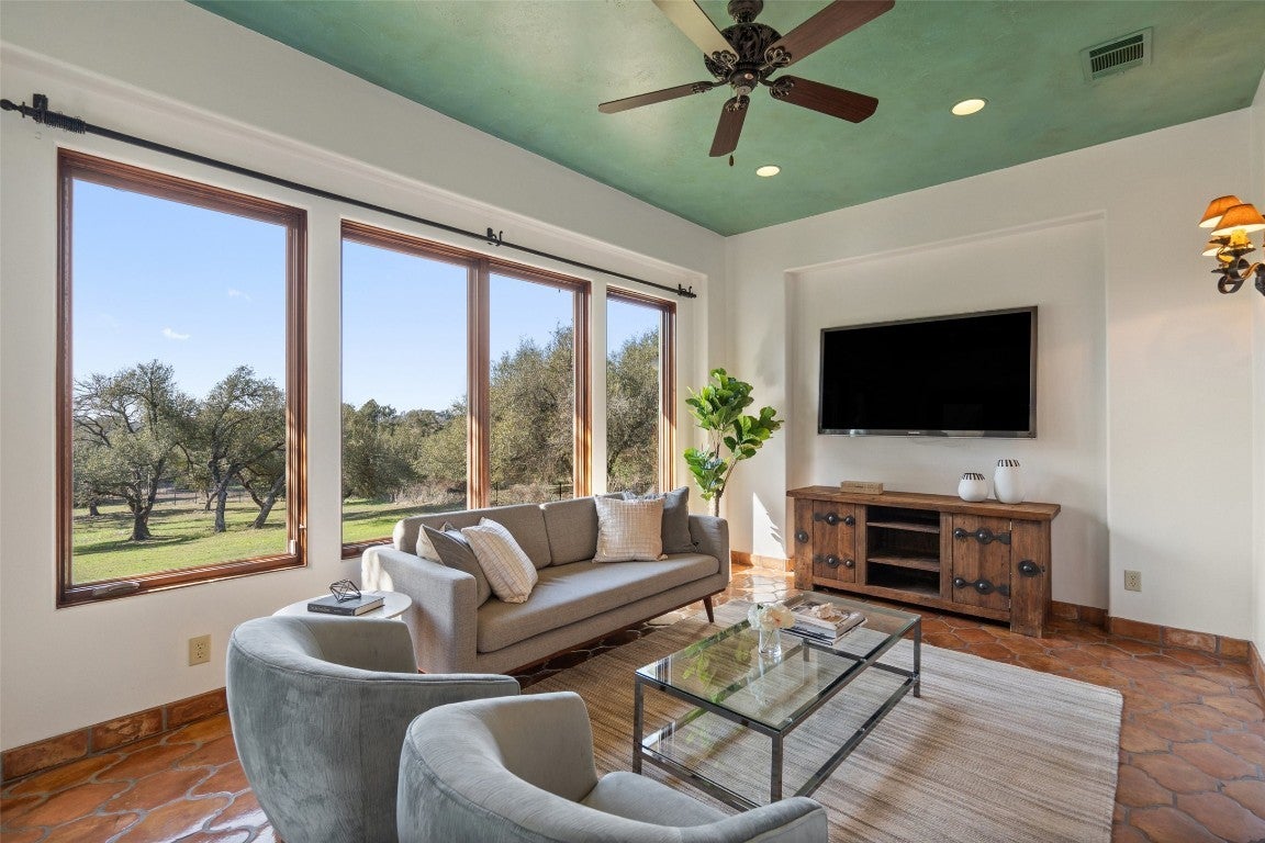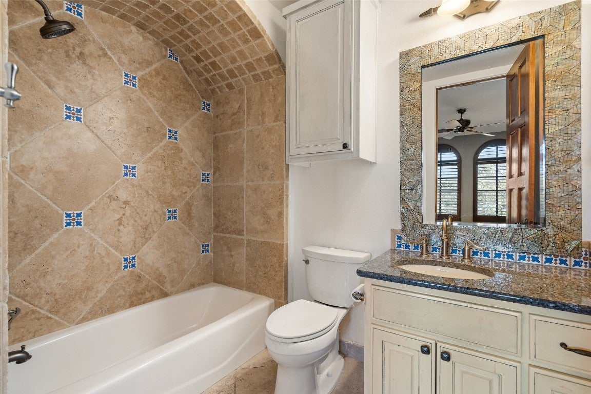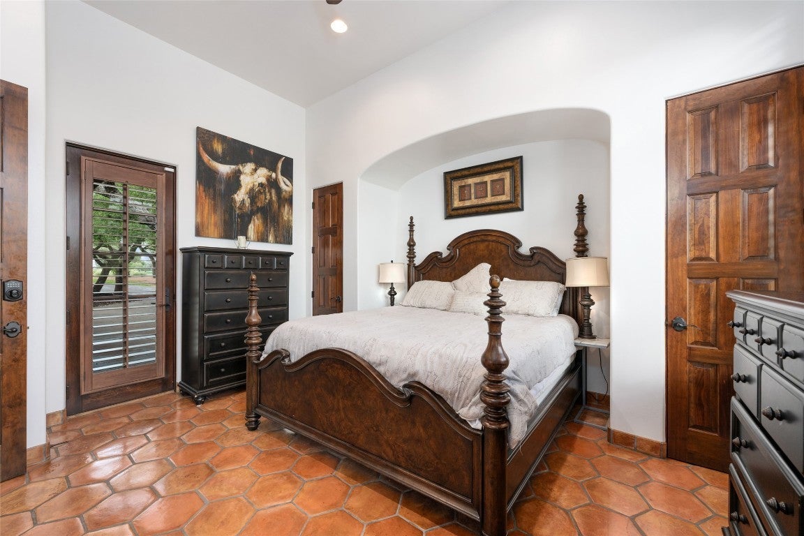 Substantial Price Improvement! Discover the epitome of luxury living in this stunning Santa Barbara-style estate, where every detail showcases exceptional craftsmanship. Elegant features such as knotty alder doors, custom tile work, and unique light fixtures highlight the thoughtful design throughout. The chef's kitchen is a culinary dream, equipped with Viking appliances, including a 48” cooktop, ice maker, warming drawer, built-in refrigerator, and a commercial-grade water treatment system. Enjoy the convenience of an oversized pantry, an additional refrigerator, a spacious utility room, and generous built-in cabinets. The dining room is a bright, inviting space, accentuated by picture windows and a wood tray ceiling. The primary bedroom is your personal retreat, with an adobe-style fireplace, wood tray ceiling, and an expansive sitting area featuring a hand-painted ceiling. The primary bathroom is completed with a jetted tub, dual vanities, walk-in shower, and two large walk-in closets. The main living area captivates with custom tile work around the fireplace, dual chandeliers, a wet bar, ice maker, beamed ceilings, and French doors opening to a covered patio. The additional family room on the lower level offers a built-in Captivate Audio entertainment system and a high-tech video security system. The upstairs media room features a kitchenette with ice maker and a full bathroom, great for entertaining. The upper-level wing includes three ensuite bedrooms, a study area, and a second washer/dryer set, while the lower-level guest room offers privacy with its own entrance and patio access. Outside, enjoy a private pool, sport court, playground, and firepit, creating a perfect outdoor sanctuary. This property is located in the acclaimed Lake Travis ISD school district and has a low tax rate of 1.76%. The community amenities include a lazy river pool, splash pad, fishing pond, 80 acre nature preserve, playscape, sport court, community center, and social events.