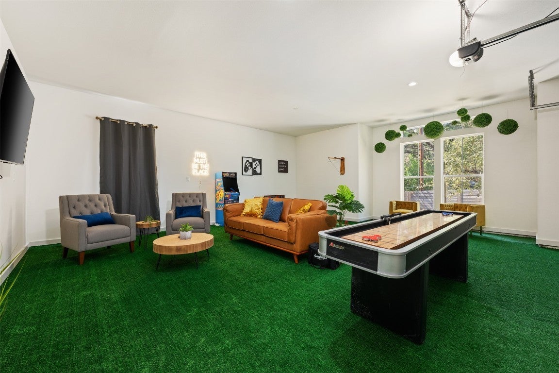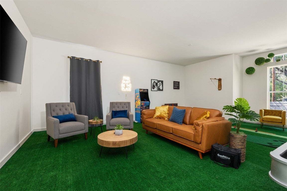 Furnished, all bills paid. New custom home with indoor putting green/ games room, pool, hot tub. The back yard with newpool provides plenty of space for entertaining with room to roam and multiple firepits. The interior features a spacious open floor plan with tremendous natural light. The living room is open to the kitchen, providing the ideal living and entertaining space. The spacious primary suite includes en-suite bathroom and an oversized walk-in shower