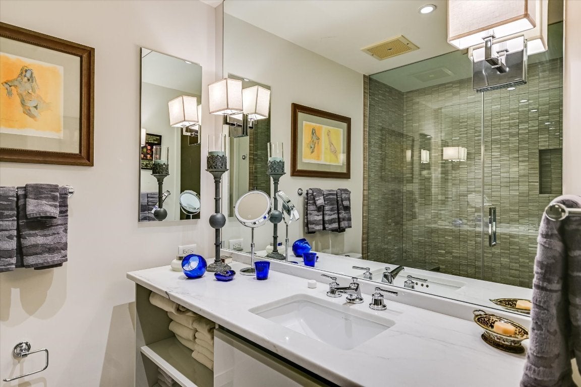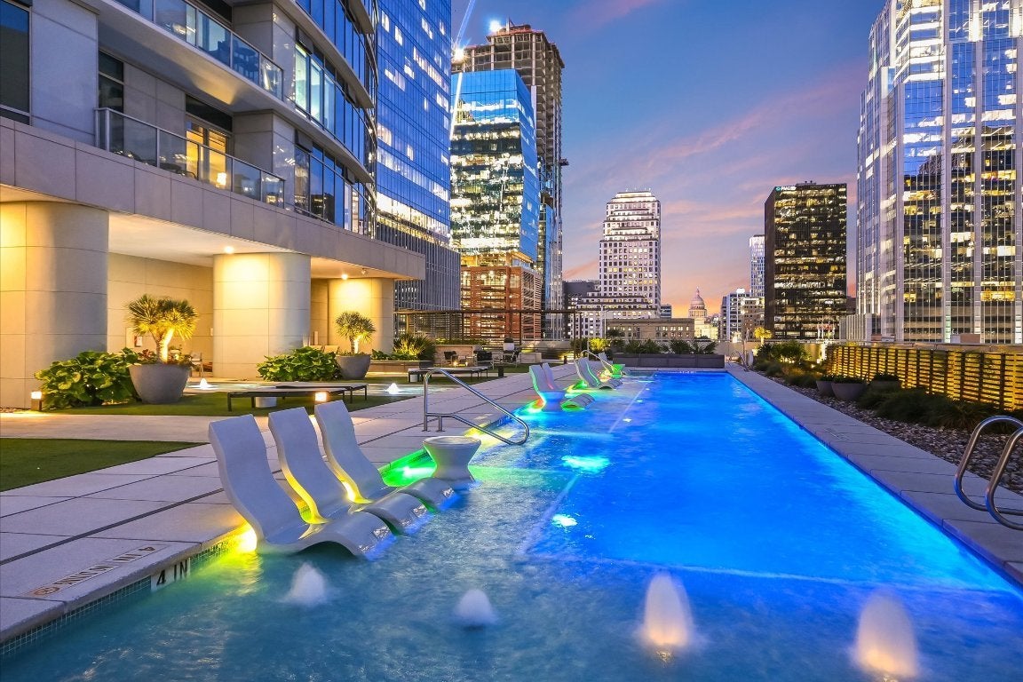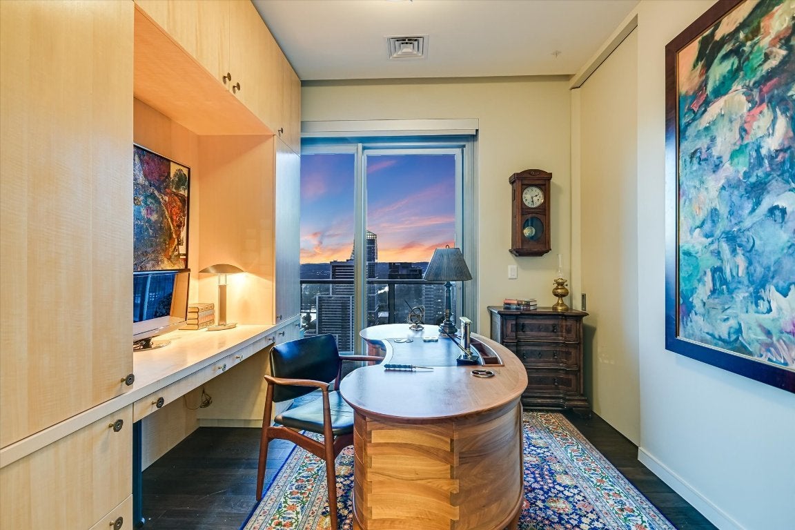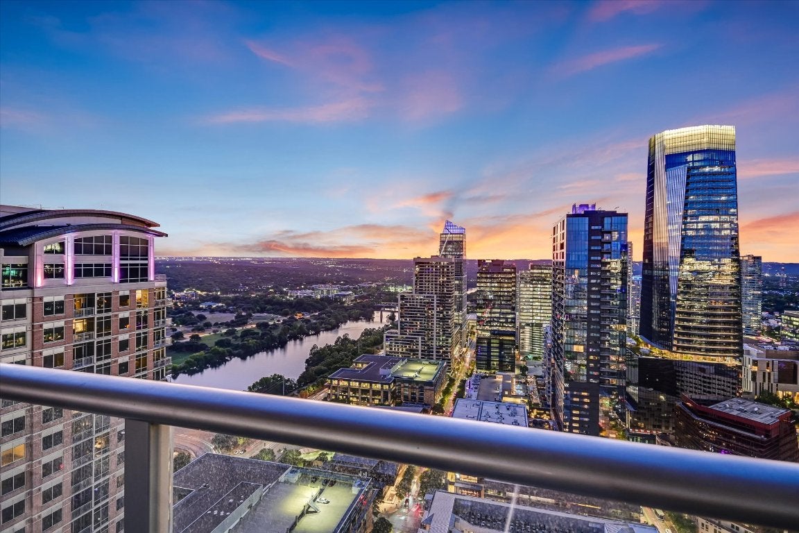 The residence at 35AC, masterfully designed by Lindsay Maki of McWalters Collaborative Architecture + Design, is truly one-of-a-kind in the building. Clearly planned with luxury and functionality at the forefront, featuring custom elements throughout, including Rift Sawn Oak cabinetry & paneling, complemented by Scavolini millwork. Premium finishes such as Ann Sacks and Artistic Tile, along with pecan flooring, add elements of warmth & sophistication. The kitchen is a chef’s dream, equipped with a built-in SubZero refrigerator, a high-end Italian Bertazzoni cooktop and double ovens, & a Miele dishwasher, all enhanced by Waterworks & Dornbracht plumbing fixtures. For convenience, there is a butler's pantry for daily appliances and a walk-in pantry that includes two full-sized wine refrigerators. The separate built-in bar, featuring a bar sink, beverage refrigerator, and floating glass shelves, makes entertaining effortless, as it is separate from the main kitchen area. This unit offers floor-to-ceiling windows and balconies with sweeping panoramic views of Lady Bird Lake, the city skyline, and the Texas Hill Country. The tranquil primary suite is a true retreat, featuring a private office and two custom-designed walk-in California Closets. A private guest suite with an en-suite bathroom boasts the same breathtaking views as the primary suite. Designed for flexibility, the den is perfect for day-to-day use, equipped with a drop-down theater screen and surround sound. However, when guests are visiting, this room transforms into a 3rd bedroom with a Murphy bed and direct access to a full bathroom. Well-thought-out storage throughout, including extra-deep closets and cabinets, drawers throughout the kitchen, and two storage units totaling over 107 SF. An integrated Savant whole-home AV system ensures seamless entertainment, enhancing the home’s state-of-the-art appeal, and incorporates automatic shades throughout. This unit has 3 garage parking spaces.