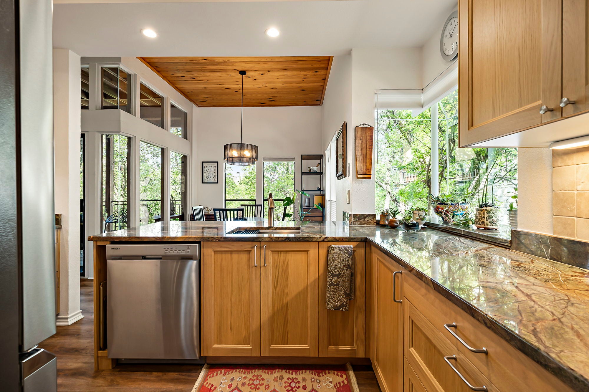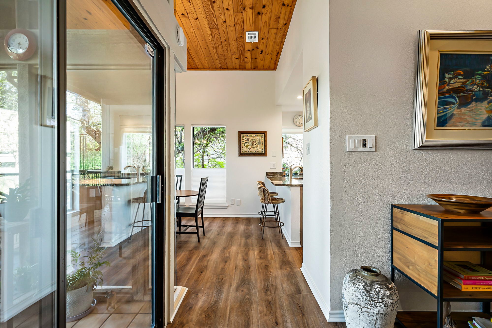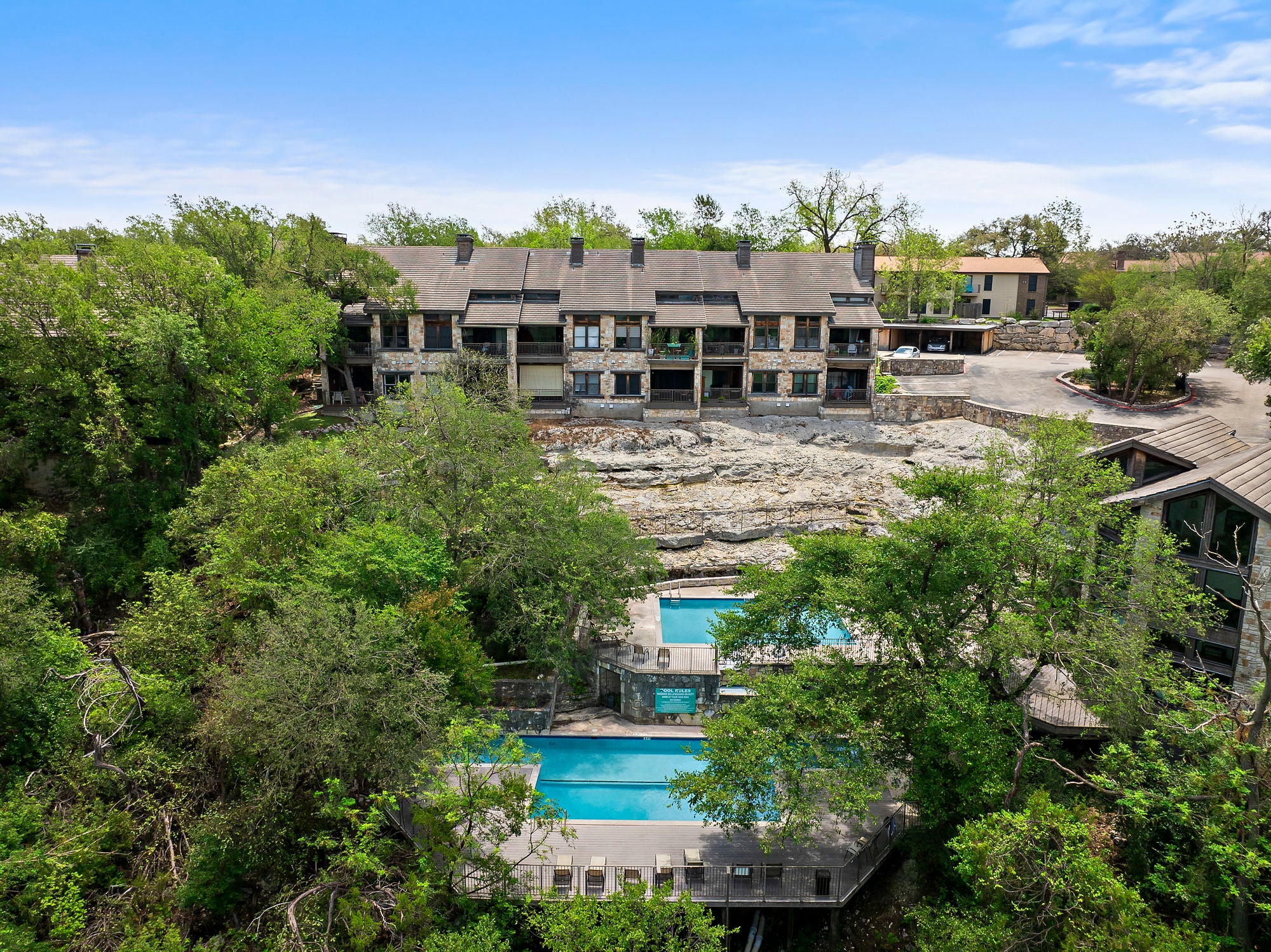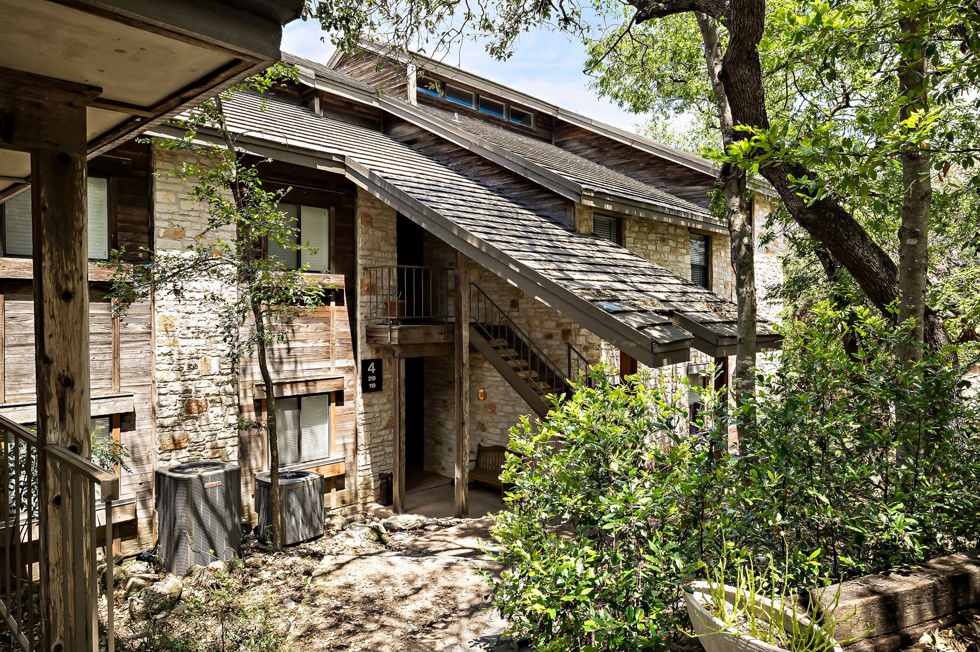 Ask about seller incentive to cover HOA fees for 12-months! Live tucked into the trees in one of Northwest Austin’s most peaceful hidden-gem communities—just minutes from everything that makes Austin life easy. This beautifully updated lower-level condo offers the rare combination of privacy, canyon-side tranquility and unbeatable access to dining, shopping, and Austin’s major employers. With entrances off both Steck Ave and Spicewood Springs, you’re ideally positioned. Community features two pools, a clubhouse, and just outside of the community you can access Steck Valley Greenbelt walking/hiking trails. Less than .05 mile to Azul Tequila, Galaxy Cafe, Troy & more. Just 2 miles to H-E-B, Arboretum, The Domain and Far West shops, with easy access to MoPac, 183, and 360. Nestled into a limestone canyon surrounded by mature trees, preserving the natural beauty that makes this community so distinctive. West-facing windows frame expansive canyon views and fill the living space with natural light. Wood-plank ceilings, vinyl plank flooring, and a wood-burning fireplace create a warm, elevated atmosphere. Updated kitchen features custom cabinetry, refreshed countertops, a bay window, upgraded sink and faucet, and a Jenn-Air downdraft range with built-in grill. Both bathrooms have been renovated with quartz counters and modern fixtures. Primary suite includes dual closets, a Whirlpool tub, and a newly tiled walk-in shower. Step outside to one of the largest covered patios in the community—an incredibly private space backing directly to the canyon, complete with fan, privacy shade, storage, and peaceful views year-round. HOA dues cover water, sewer, trash/recycling/composting, pest control, exterior maintenance, landscaping, pool care, and included structure insurance—making ownership low-maintenance. Additional highlights include Hunter Douglas blinds, ceiling fans, HVAC replaced in 2021, reserved covered parking, private storage shed, and plenty of guest parking nearby.