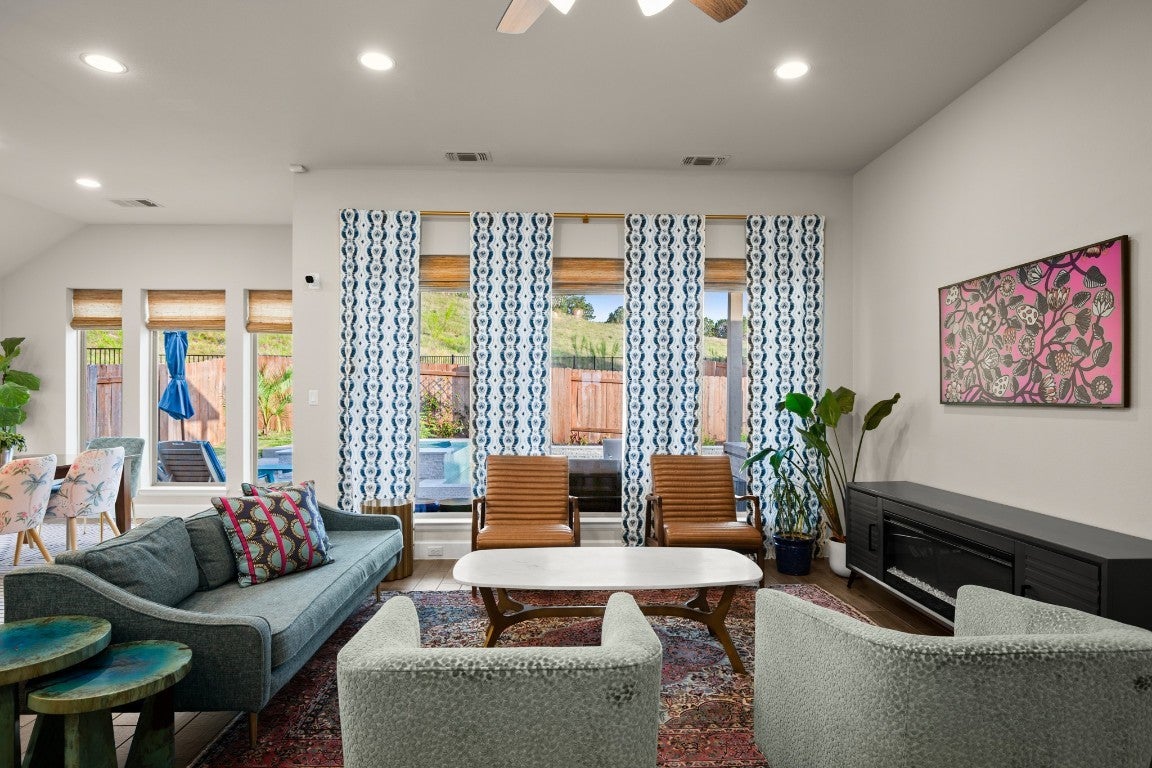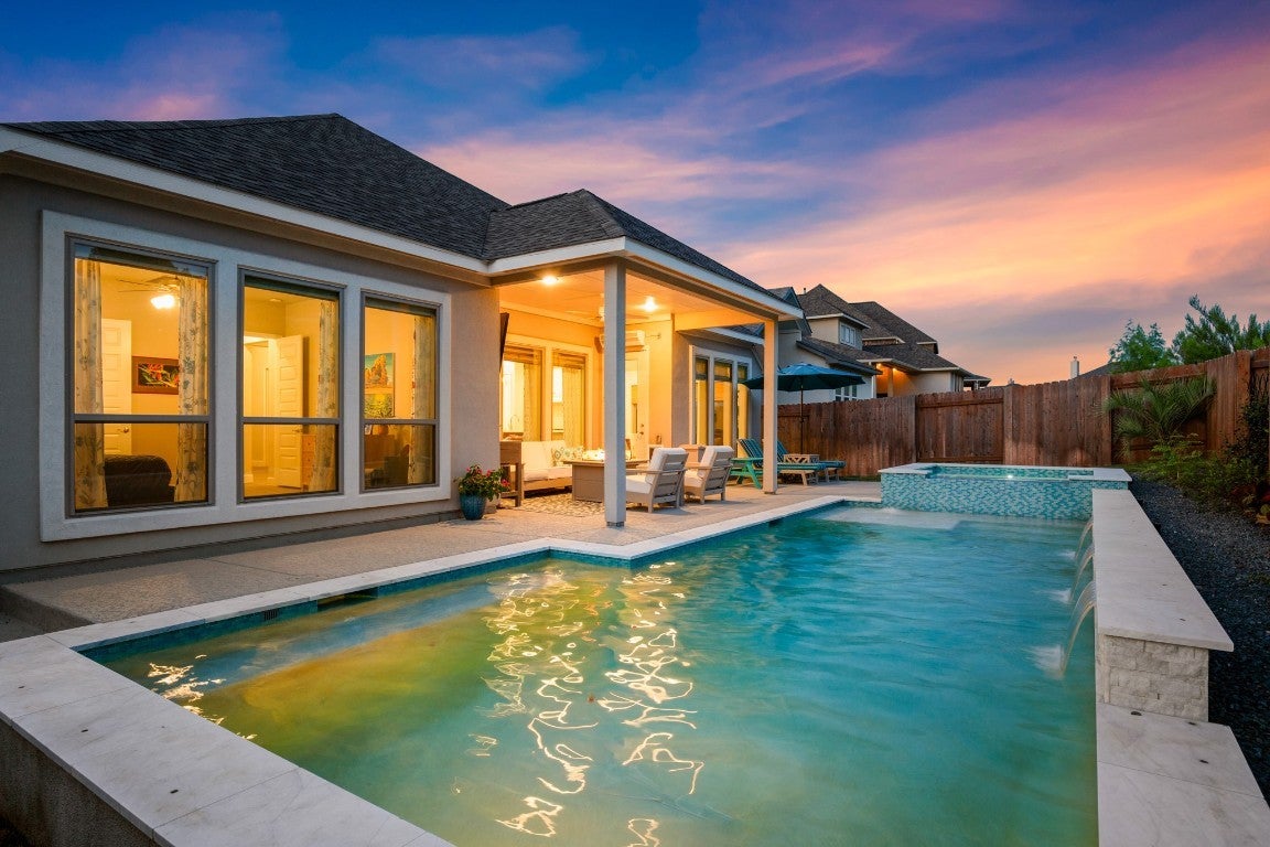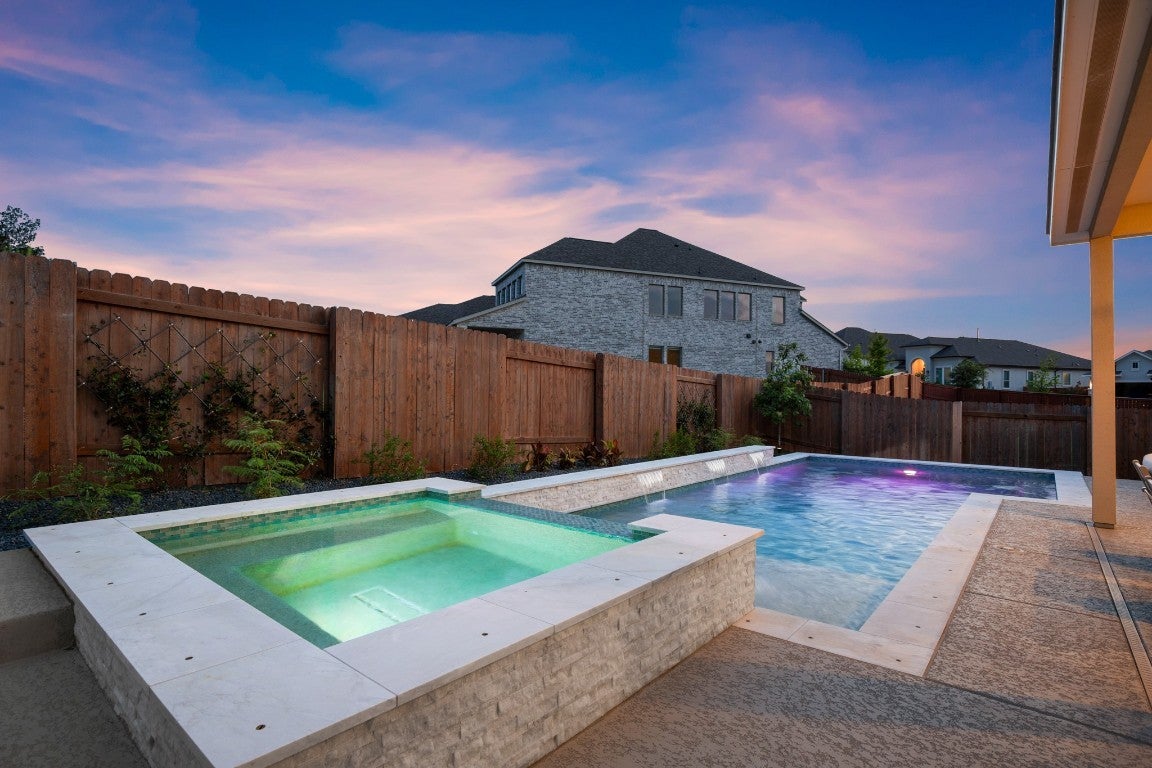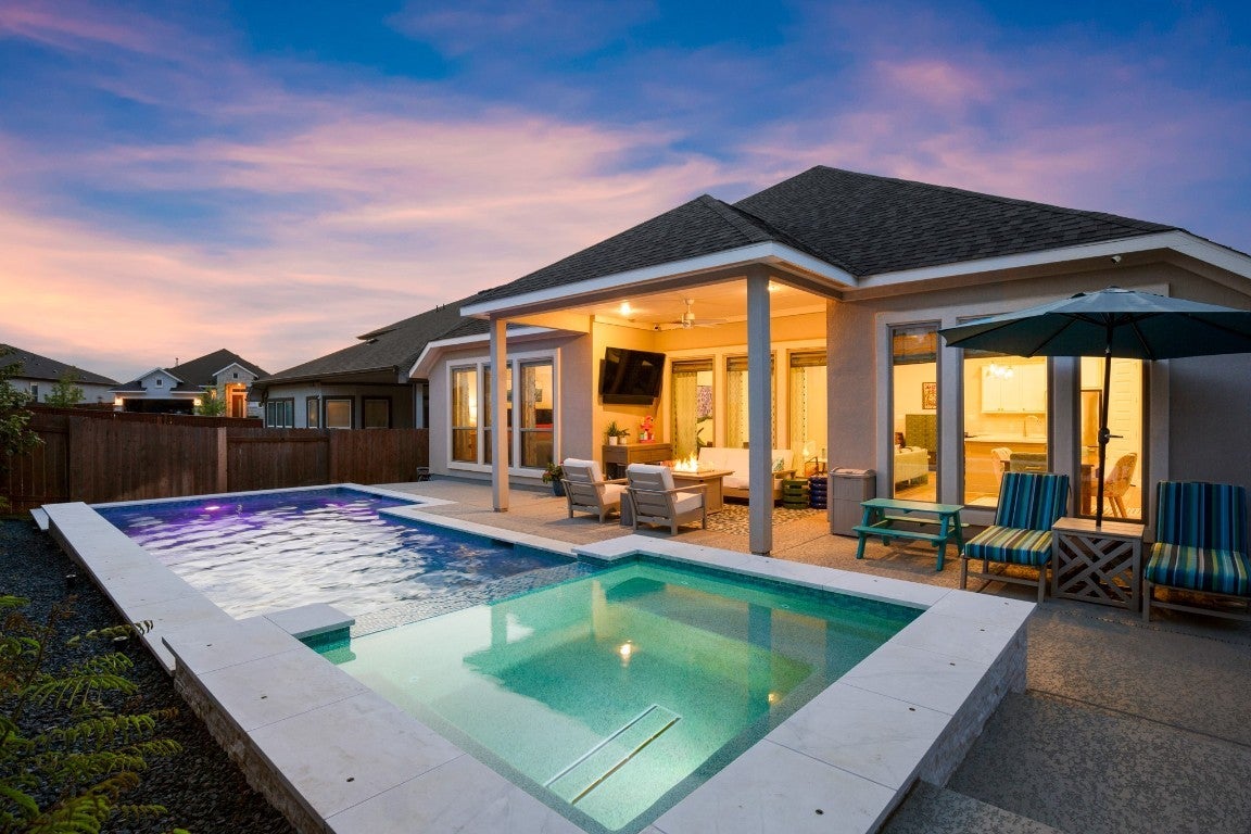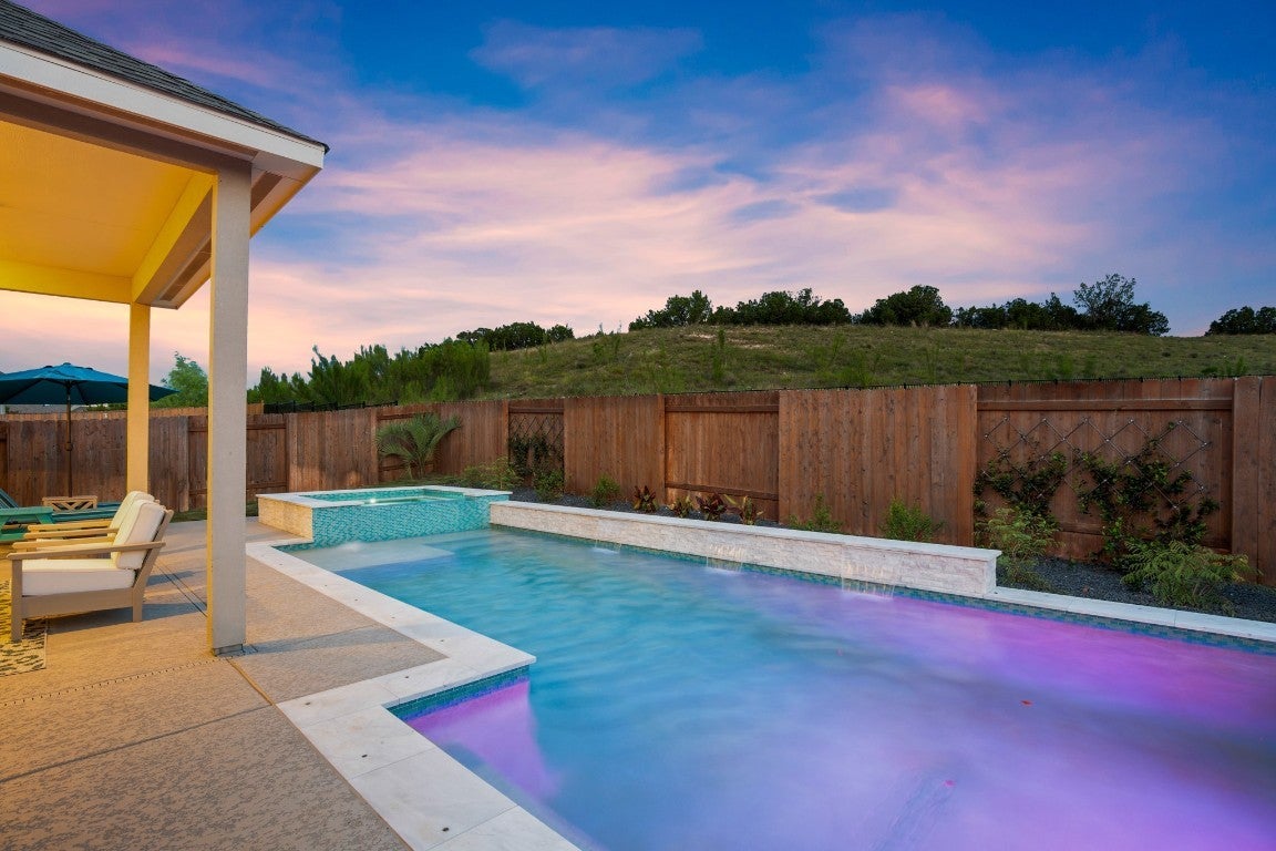 Limited Time Incentives—Contact Agent for Details! Experience elevated Hill Country living in this stunning designer home with a resort-style backyard! Welcome to 18621 James Power Court — a beautifully upgraded Perry Homes residence nestled on a quiet cul-de-sac in the sought-after Sweetwater community, located within the award-winning Lake Travis ISD. Blending modern elegance, thoughtful upgrades, and resort-inspired outdoor living, this home redefines the Austin lifestyle. Step inside and you’ll immediately feel the openness of the flowing layout, where high ceilings, wood-look tile floors, and expansive picture windows fill the spaces with natural light. The chef’s kitchen is a showstopper—featuring a sprawling quartz island, gleaming white cabinetry, stainless steel appliances, and designer pendant lighting that adds a touch of sophistication. The living room’s oversized windows frame serene views of the sparkling pool and spa, complete with waterfall and custom lighting features. It’s an entertainer’s dream inside and out with ample space to dine, lounge, and unwind beneath the stars. Retreat to the luxurious primary suite with its own wall of windows overlooking the backyard oasis. The ensuite bath features dual vanities, soaking tub, and spa-style shower. 3 additional bedrooms offer flexibility for family, guests, or hobbies, while the dedicated home office and French-doored game room create distinct spaces to work and play. Well-curated upgrades enhance daily living, from automatic window treatments and epoxy-coated garage flooring to a whole-home water softener and filtration system and landscaping. Security and convenience are seamlessly integrated with a smart alarm system featuring five cameras, along with outdoor holiday lighting that adds effortless charm year-round.