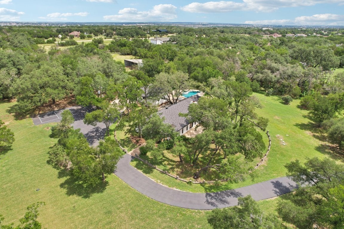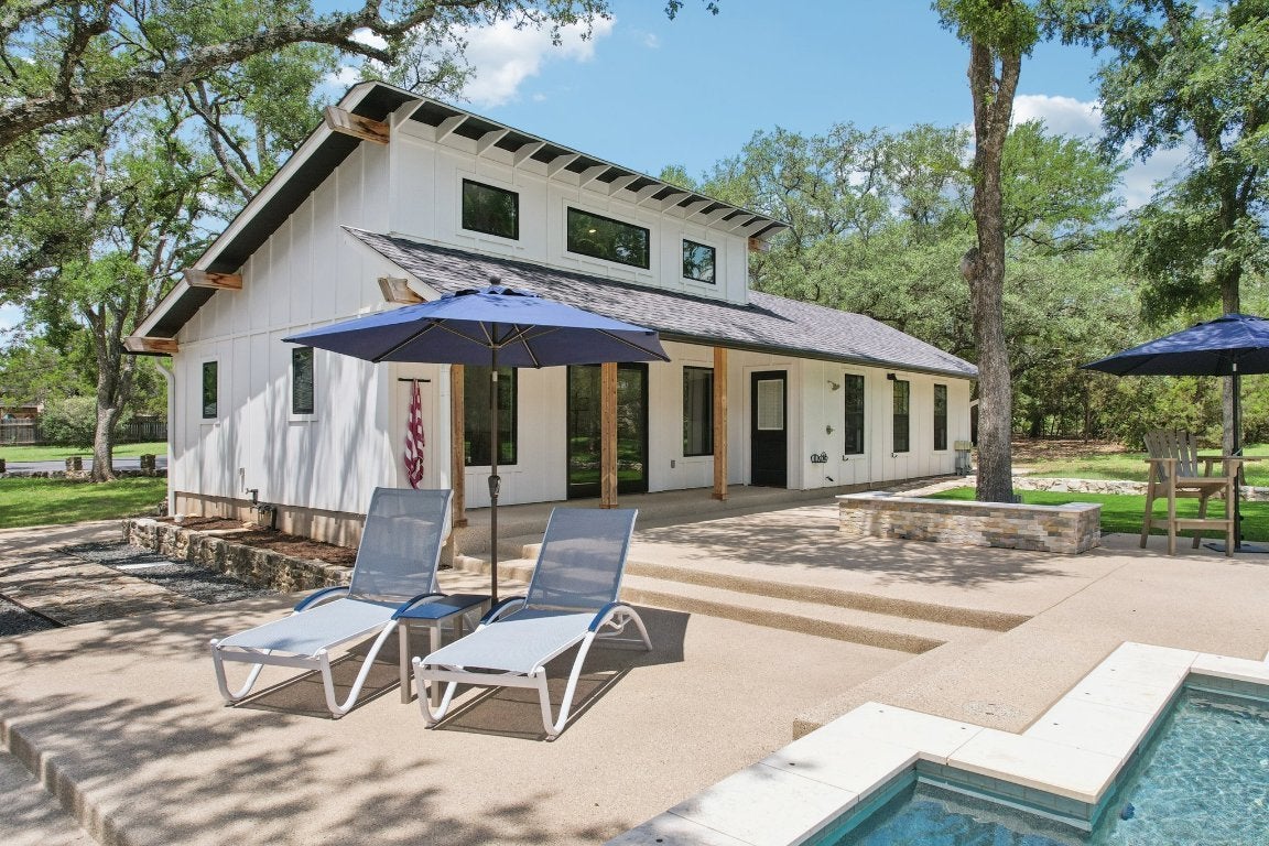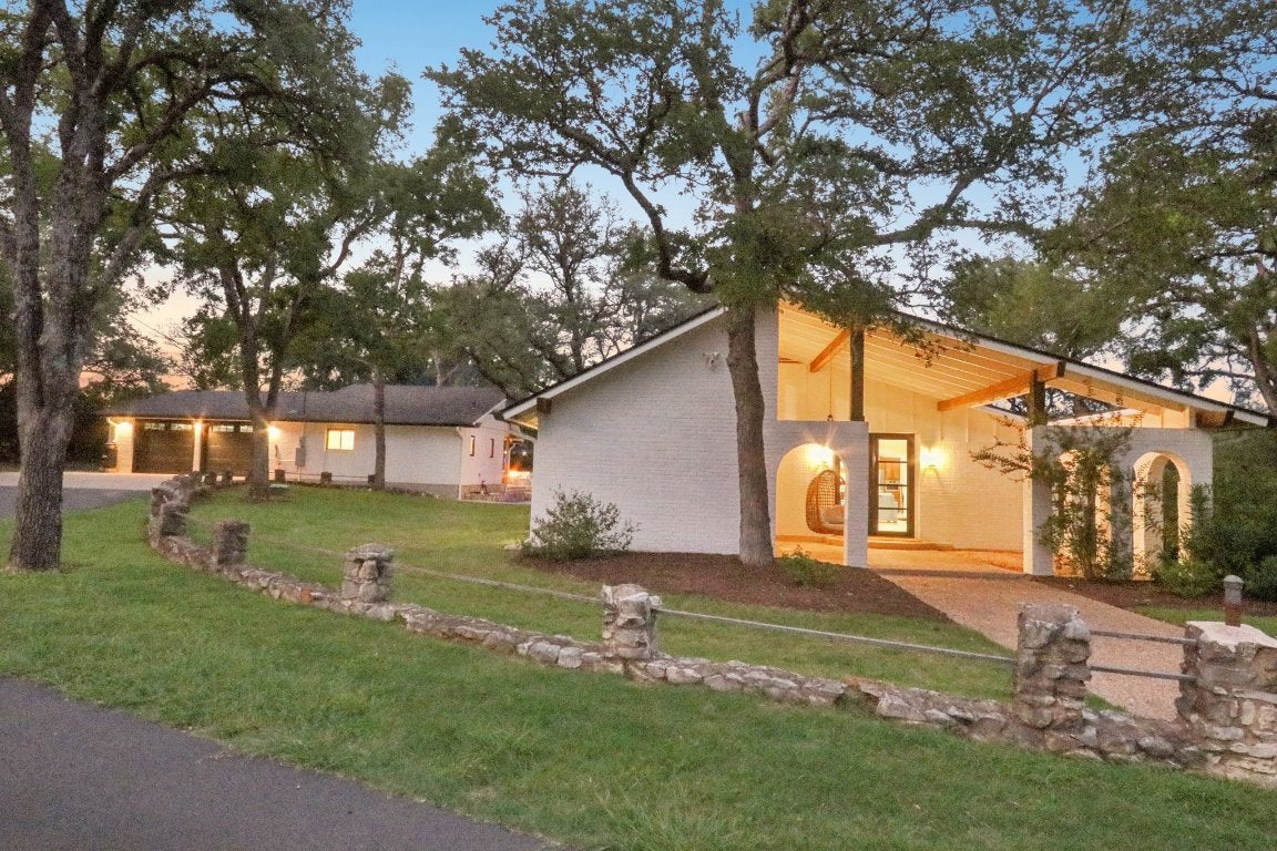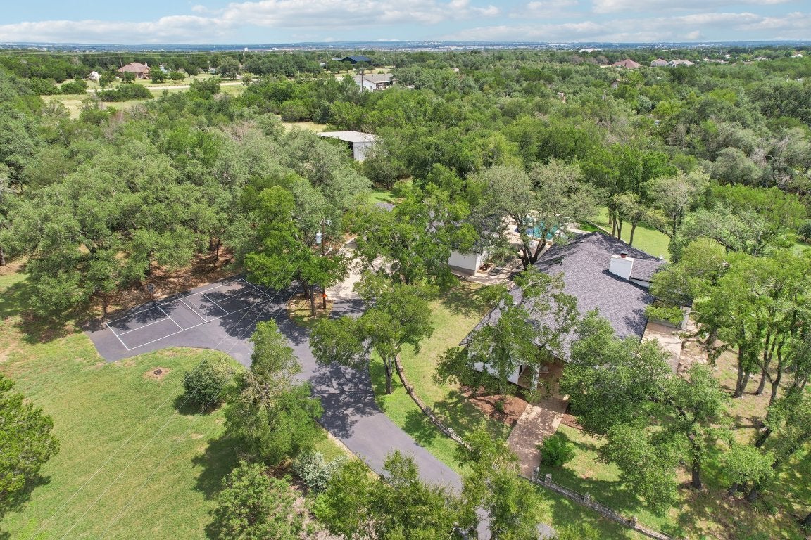 Tucked behind a private gate on 4 oak-studded acres in the coveted North Lake community, 707 Harbor Dr is more than just a home—it’s a sanctuary where nature, luxury, and recreation coexist in perfect harmony. This thoughtfully reimagined 3-bedroom, 2-bathroom main residence spans 2,500 square feet and has been completely transformed from the studs up between 2019–2020. Originally crafted in 1978, the home now showcases a stunning modern design infused with timeless materials and meticulous attention to detail. Raised ceilings and Marvin black-framed windows flood the space with natural light, while wide-plank 48”x24” tile floors and solid-core doors add a touch of quiet luxury throughout. At the heart of the home, the gourmet kitchen commands attention with custom walnut cabinetry, sleek Quartz countertops, a granite composite sink, and premium stainless appliances—including a 5-burner induction cooktop and built-in Bosch WiFi coffee maker. The living area features dramatic cathedral ceilings, and the dining room rises to an impressive 12 feet, making gatherings both grand and comfortable. The primary suite is a true retreat, offering double doors to a shaded patio and a spa-like ambiance amid the tranquil landscape. The recent 2022–23 addition of a fully finished 600 sq ft guest house elevates the experience for visitors or multi-generational living. With its own bedroom, bathroom, kitchenette, and living space, guests can enjoy views of the resort-style, multi-tiered pool and hot tub, which flow seamlessly into an expansive sun-shelf and catch basin waterfall feature. Surrounding it all is lush, high-grade artificial turf for year-round vibrancy and minimal upkeep. And for those seeking activity and entertainment, an extended paved area leads to a custom pickleball court—perfect for spirited games with friends or neighbors. A paved drive and ample parking make hosting a breeze, while the short drive to Lake Georgetown offers endless outdoor adventures nearby.