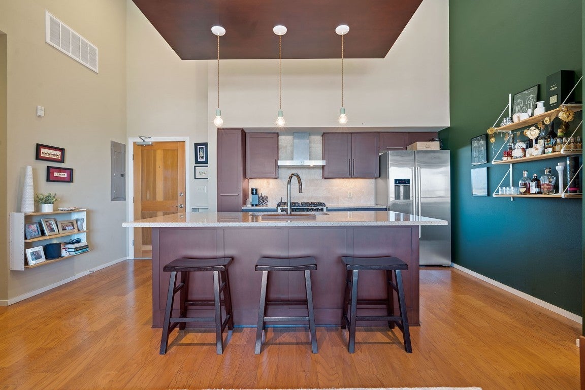 Live where Austin plays at BartonPlace! Perfectly positioned between iconic Zilker Park and the vibrant city center, this incredible community truly offers residents the best of both worlds. This rare Penthouse Residence features 16’ barrel arched ceilings, floor to ceiling windows throughout, and a peaceful private corner location overlooking the community garden. Enjoy outdoor living on the rooftop terrace located just down the hall, fully outfitted with gas grill and comfortable seating – the perfect place to entertain or relax. Convenience is maximized with two superior parking spaces located right next to the elevator. BartonPlace offers residents a mix of modern luxury, convenience, and an active, outdoorsy lifestyle, making it one of Austin's most sought-after residential condo communities. Community amenities include a heated saltwater pool with a lounging and grilling area, four rooftop terraces with grills, expansive outdoor spaces including a community garden, an Owner’s lounge with kitchenette, a guest suite for overnight visitors, a fitness room, a dog run, and a secure, gated environment with attentive 24-hour concierge service.