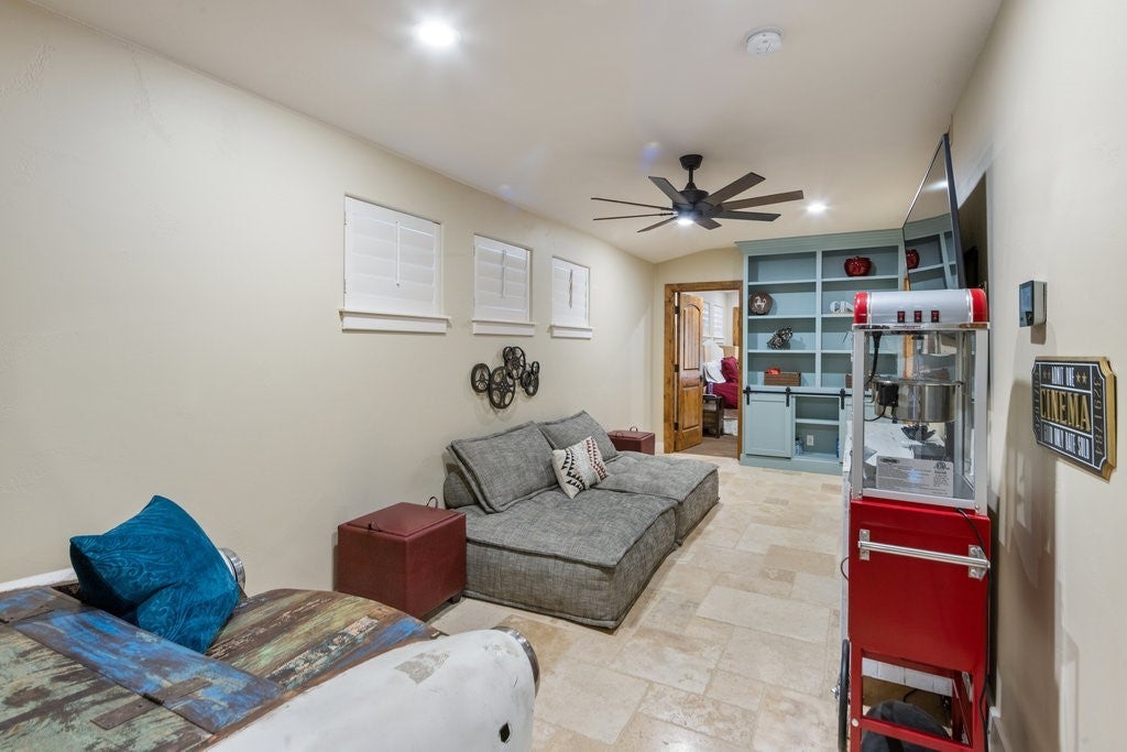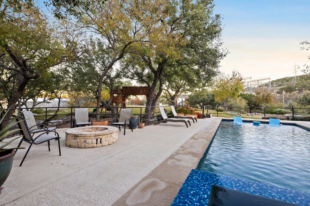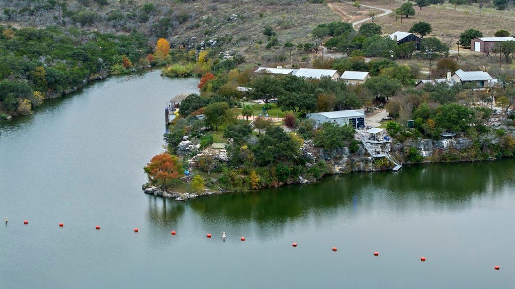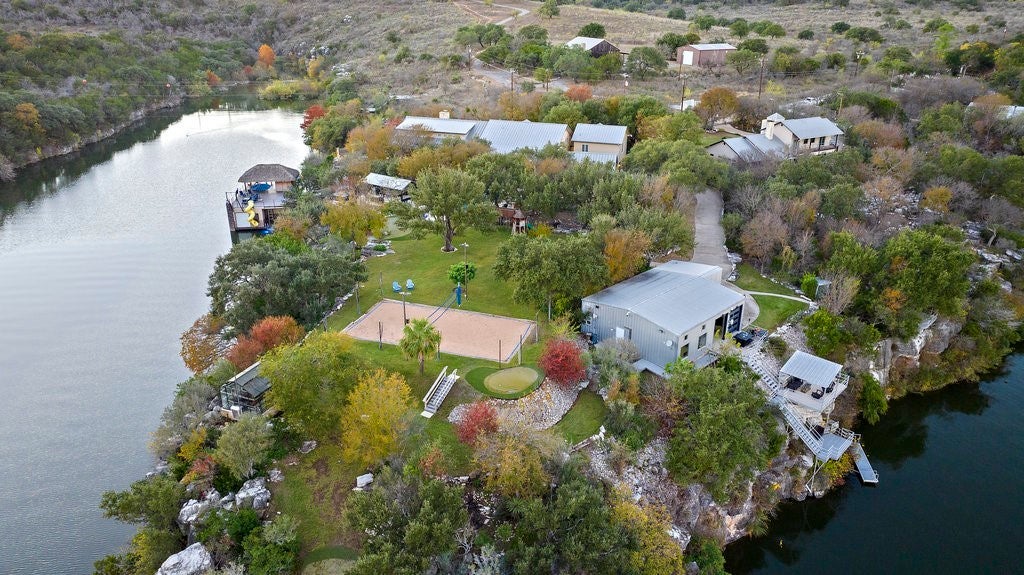This extremely rare waterfront property located at the end of Los Escondidos Street on the peninsula of Lake Marble Falls is surrounded with open water on one side and a deep water cove on the other, giving lake access to each. On the cove side is an incredible boathouse with 2 enclosed boat slips, a jet ski platform, and a second floor outdoor entertainment area with a summer kitchen, sleeping quarters for up to four, a water slide, rope swing and a rock climbing wall! The open water side has a day dock with a swimming platform and viewing deck above. Adjacent is the party barn equipped with a golf simulator, arcade games, as well as a bar overlooking the lake and includes a full bathroom. The beautiful 6 bedroom | 4 bathroom home has abundant natural light and an open floor plan, perfect for entertaining. The gourmet kitchen includes two large islands as well as professional-grade appliances. The primary suite is on the main level with 5 additional bedrooms upstairs. There is also a two-car garage with a 1 bedroom | 1 bathroom apartment above. This 1.97 acre property also includes a sand volleyball court, a gorgeous pool with outdoor kitchen, putting greens, a greenhouse, walking trails, mature trees, rock formations, fire pits, and a playscape. This property is the perfect place to come unwind, relax and connect with nature. MAIN HOUSE: 6 bedrooms | 4 bathrooms | 4,403 sqft (Cubicasa app) GARAGE APARTMENT: 1 bedroom | 1 bathroom | 578 sqft (Cubicasa app) Lot size per survey