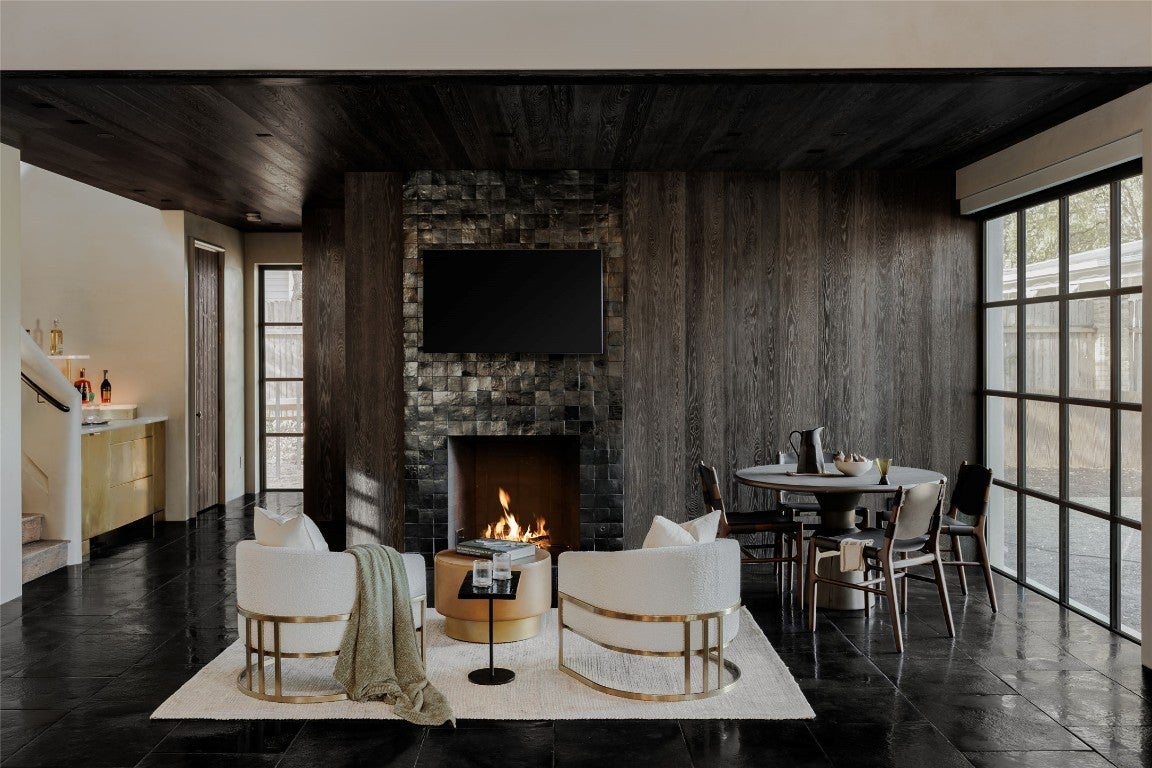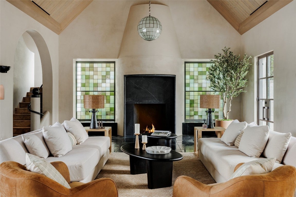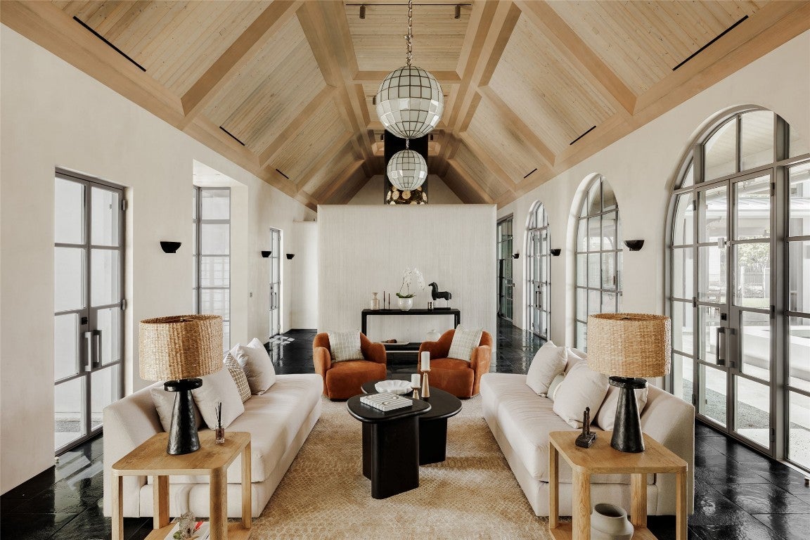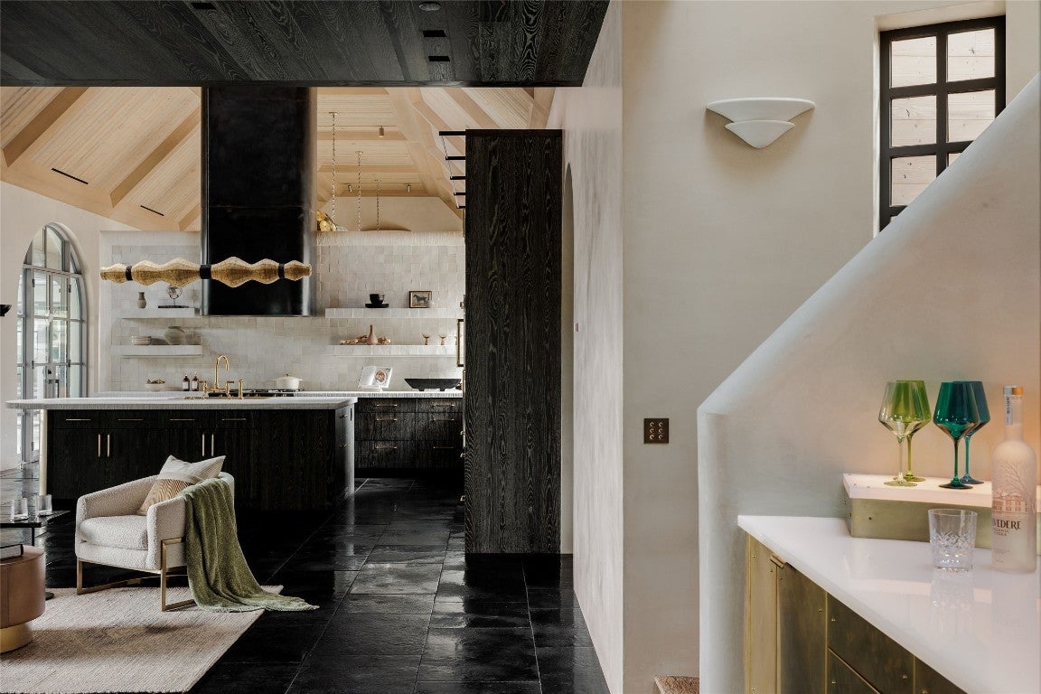 Tucked at the end of a quiet cul-de-sac and set behind a seven-foot privacy wall, 2600 Tanglewood Trail is a one-of-a-kind architectural masterpiece in the heart of Tarrytown. Built by Dalgleish Construction on over half an acre, this home marries Old World craftsmanship with modern design, offering enduring elegance and contemporary comfort in one of Austin’s most coveted neighborhoods. The Vermont slate roof and custom steel-framed doors and windows by Presidio set the tone for the bespoke interiors within. Hand-applied plaster walls, two-inch Calacatta marble with chiseled edges, black limestone imported from India, and reclaimed barnwood floors create a richly layered aesthetic. At the heart of the home, the kitchen makes a striking statement with its sculptural 19-foot steel vent hood, custom white oak cabinetry, and top-of-the-line appliances. The adjacent living area features a custom brass-plated bar with illuminated shelving, while the great room, highlighted by a coffered spruce ceiling, soapstone fireplace, and stained-glass accents brings warmth and sophistication to everyday living. The first-floor primary suite serves as a serene retreat with dual spa-like bathrooms featuring heated limestone floors, Moroccan Zellige tile, unlacquered brass fixtures, and electrochromic privacy glass. Upstairs, reclaimed barnwood floors and skylit hallways lead to spacious bedrooms with custom baths and integrated built-ins. Designed for seamless indoor-outdoor living, the backyard resembles a private resort with a pool and spa by Cascade Custom Pools, lush landscaping, and architectural lighting. The covered Moroccan-inspired terrace offers heated flooring, a fireplace, and a soapstone grill station for year-round entertaining. A rare opportunity to own a newly built Dalgleish home in one of Austin’s most established neighborhoods.