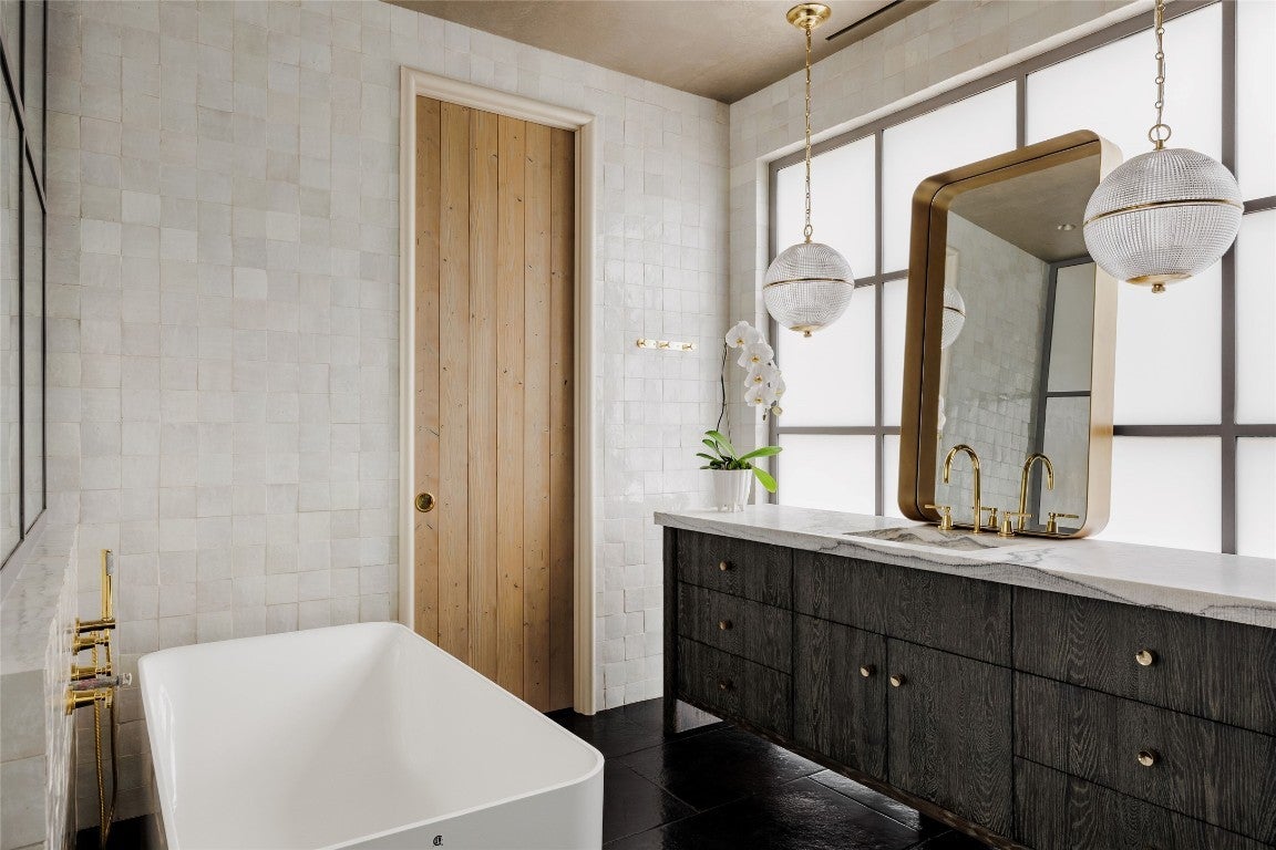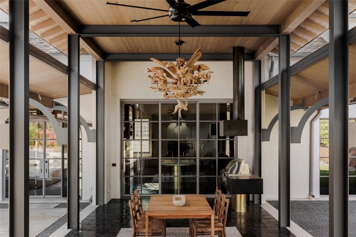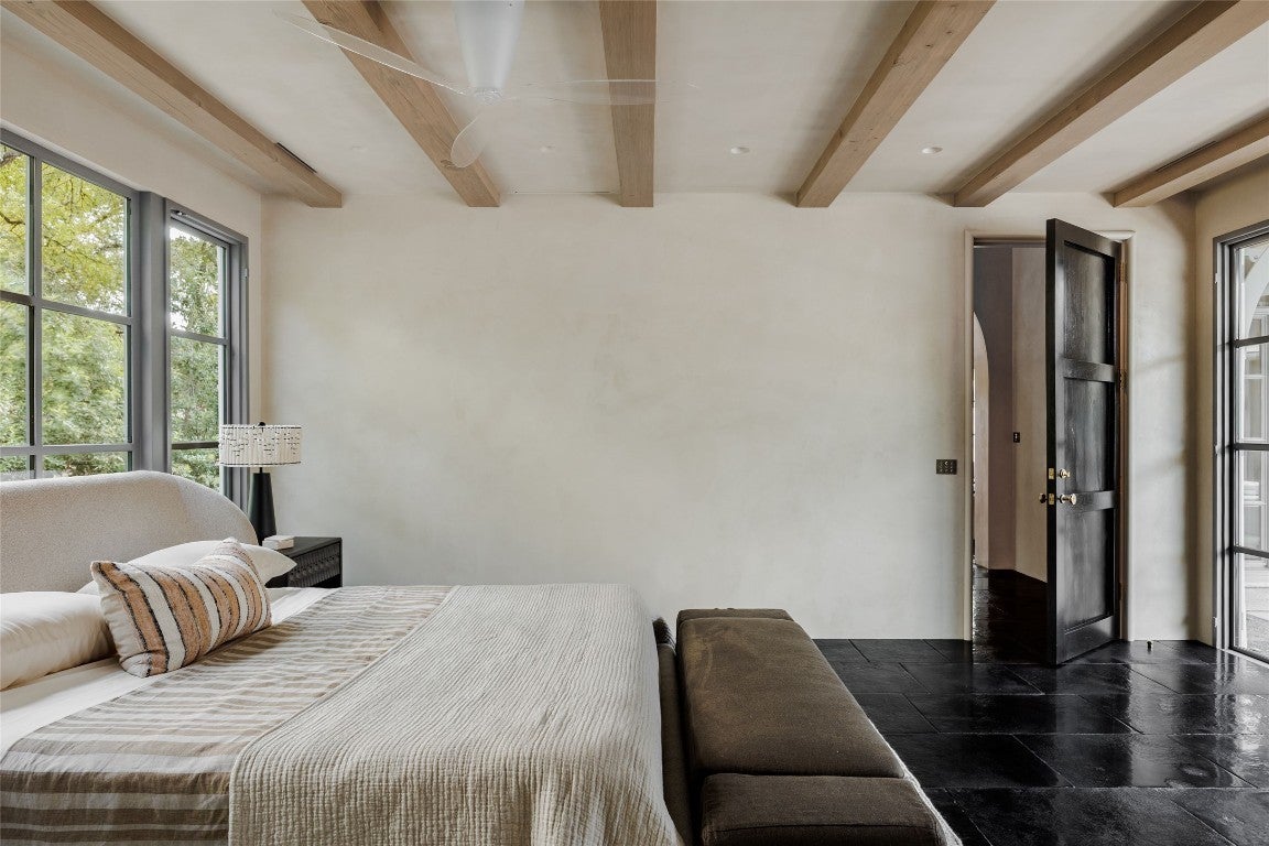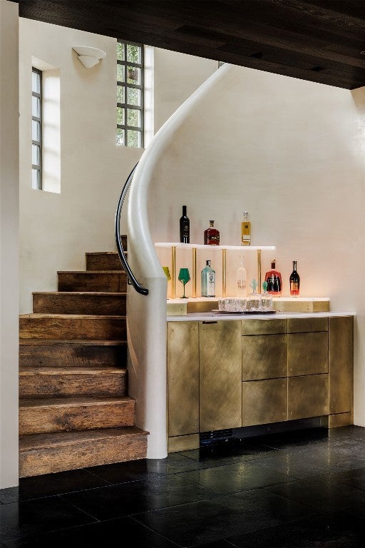 Tucked at the end of a quiet cul-de-sac and set behind a seven-foot privacy wall, 2600 Tanglewood Trail is a one-of-a-kind architectural masterpiece in the heart of Tarrytown. Built by Dalgleish Construction on over half an acre, this home marries Old World craftsmanship with modern design, offering enduring elegance and contemporary comfort in one of Austin’s most coveted neighborhoods. The Vermont slate roof and custom steel-framed doors and windows by Presidio set the tone for the bespoke interiors within. Hand-applied plaster walls, two-inch Calacatta marble with chiseled edges, black limestone imported from India, and reclaimed barnwood floors create a richly layered aesthetic. At the heart of the home, the kitchen makes a striking statement with its sculptural 19-foot steel vent hood, custom white oak cabinetry, and top-of-the-line appliances. The adjacent living area features a custom brass-plated bar with illuminated shelving, while the great room, highlighted by a coffered spruce ceiling, soapstone fireplace, and stained-glass accents brings warmth and sophistication to everyday living. The first-floor primary suite serves as a serene retreat with dual spa-like bathrooms featuring heated limestone floors, Moroccan Zellige tile, unlacquered brass fixtures, and electrochromic privacy glass. Upstairs, reclaimed barnwood floors and skylit hallways lead to spacious bedrooms with custom baths and integrated built-ins. Designed for seamless indoor-outdoor living, the backyard resembles a private resort with a pool and spa by Cascade Custom Pools, lush landscaping, and architectural lighting. The covered Moroccan-inspired terrace offers heated flooring, a fireplace, and a soapstone grill station for year-round entertaining. A rare opportunity to own a newly built Dalgleish home in one of Austin’s most established neighborhoods.