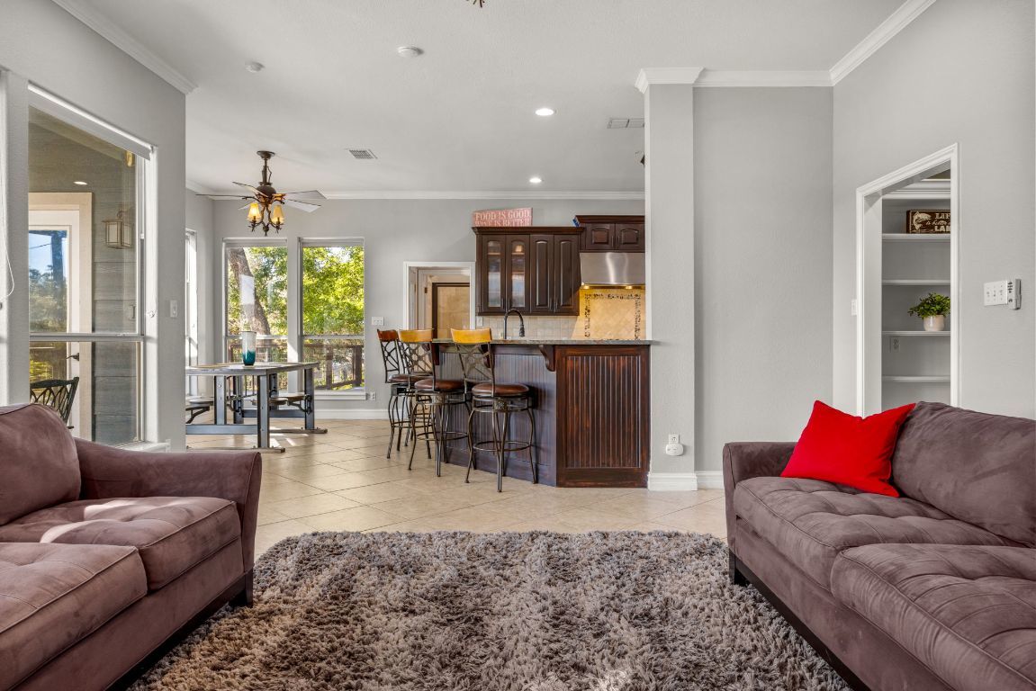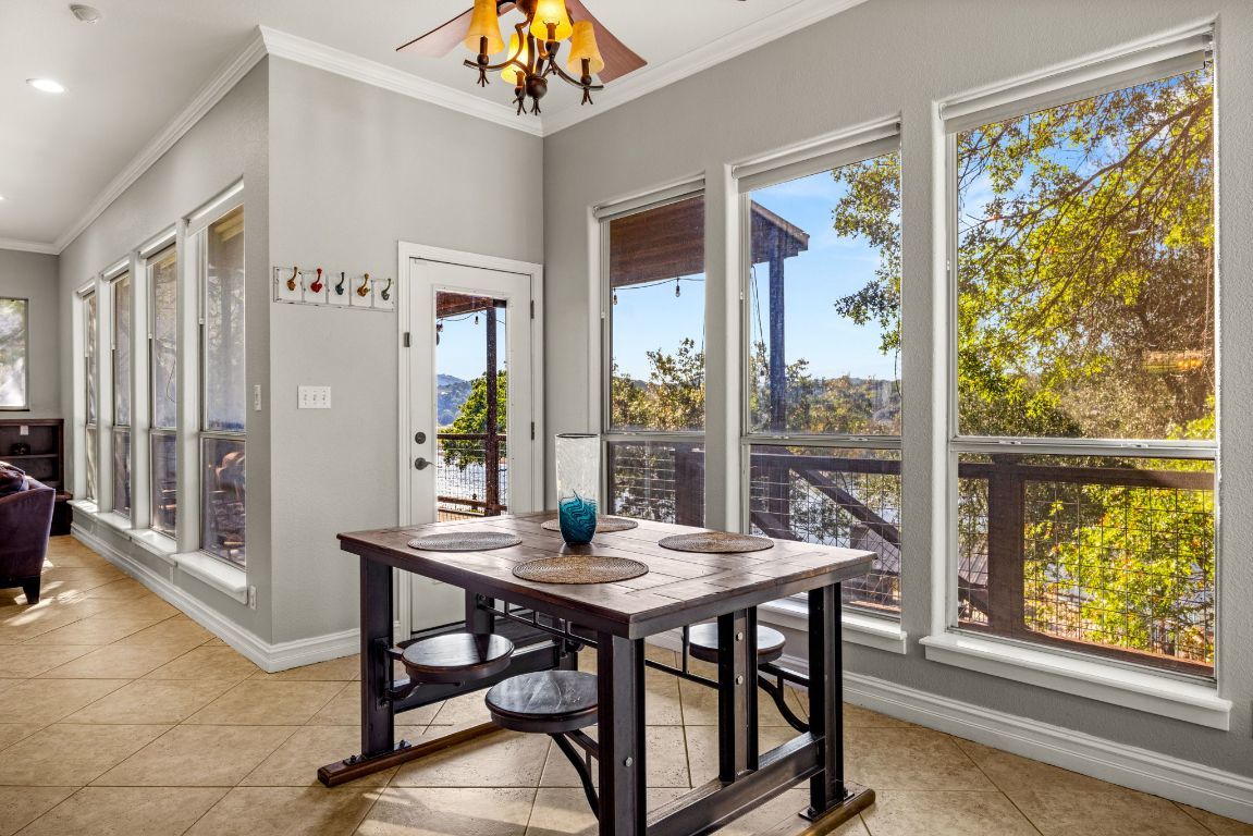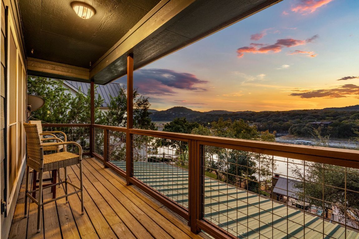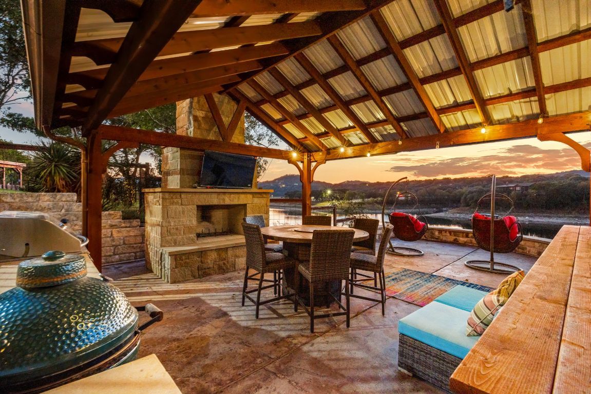 Welcome to your lakefront oasis nestled in the private hills of Lake Travis, where breathtaking Hill Country and water views create a serene, resort-style escape. Whether you're seeking a peaceful personal retreat or a lucrative investment opportunity, this rare property is fully furnished and ready to enjoy or rent from day one. A charming guest house greets you upon arrival, offering warm wood accents and cozy, cabin-like character—ideal for visitors or home office. The main residence sits further down the drive, showcasing beautiful stonework and timeless curb appeal. Inside, a light-filled layout features a welcoming living room with fireplace and a wall of windows, seamlessly connecting you to the surrounding landscape. The chef’s kitchen is designed for entertaining, with stainless steel appliances, a professional-grade refrigerator, and extensive storage. The primary suite is a true sanctuary with private balcony access, a spa-style bath featuring dual vanities, walk-in shower, soaking tub, and a spacious closet. Make your way outside to multi-level decks designed for relaxation and gatherings, complete with shaded lounging areas and an infinity-edge pool and spa that overlook Lake Travis. The outdoor pavilion kitchen is fully equipped with a grill, refrigerator, fireplace, TV, and pull-down shades—perfect for hosting everything from game day to sunset dinners. A gentle private walkway leads down to your personal boat dock, offering effortless lake access. With solar panels for energy savings, an expansive yard for recreation or future additions, owner financing options, and easy access to Austin, this one-of-a-kind property checks every box.