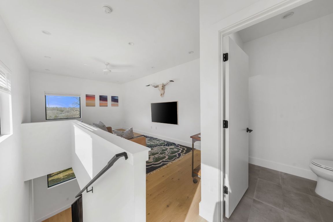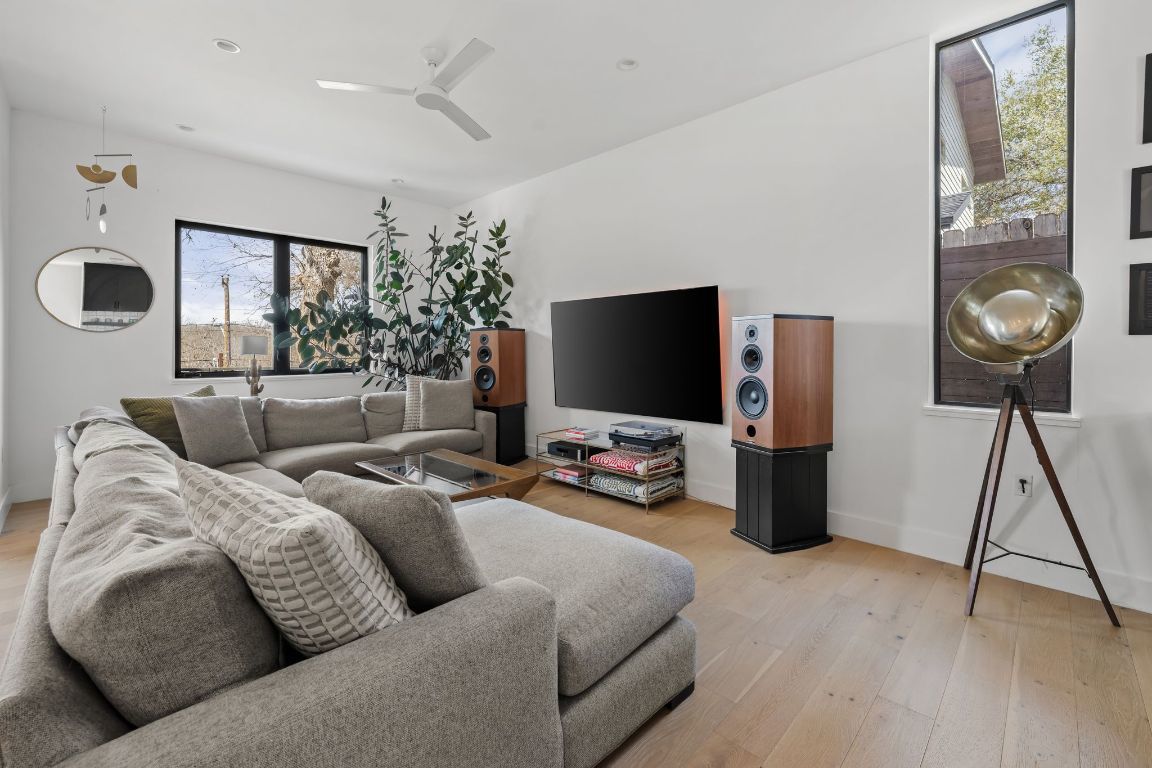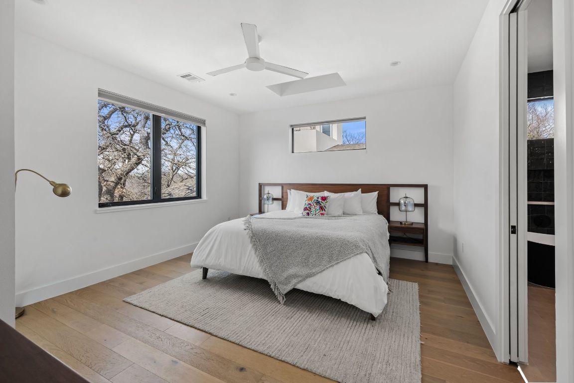 Welcome to 1301 Deloney St., a stunning modern residence designed by renowned Davey McEathron Architecture and built by Juneberry Homes, offering panoramic Downtown skyline views! The exterior’s mix of smooth stucco, warm natural wood, & artisan breezeway blocks sets an inviting tone that carries throughout the home. Step through the glass-paneled front door into an open floor plan that seamlessly connects the various living spaces, including a bedroom and full bathroom conveniently located on the main floor, making it ideal for guests or a home office. The open & airy design of the living area flows into the kitchen & dining spaces, creating the perfect backdrop for entertaining and everyday living. The high-end kitchen features Taj Mahal stone countertops, custom cabinetry, sleek black fixtures, & a high-end Thermador appliance package. On the 2nd floor, discover 3 serene bedrooms, including a spacious primary suite designed as a private retreat w/ dual vanities, ample cabinetry, an oversized countertop, & a luxurious walk-in shower w/ soaking tub. The expansive walk-in closet connects directly to the second-floor laundry room for everyday convenience. The 3rd floor features a bonus flex space a versatile option for an office, gym, den, or playroom as well as a large rooftop deck with sweeping, unobstructed views of Downtown. The backyard is xeriscaped & the large backyard deck is perfect for entertaining guests, extending the living area into the beautiful outdoors. Other features include a terra-cotta built-in bench in the living room, handcrafted metal screening, 1-car garage with an EV ready plug, gutters, & full irrigation. Situated in a prime East Austin location, you’re a stroll away from Palomino’s Coffee, Birdie’s, Givens Park, just minutes to Downtown and ABIA & all of East Austin's offerings.