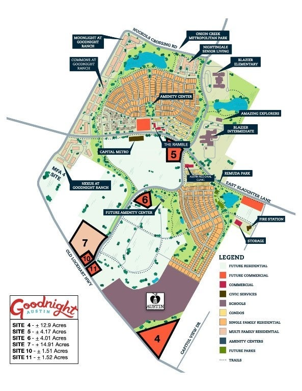Goodnight Commercial Site #4 is a ±12.9-acre tract in the rapidly growing Goodnight Ranch community, sitting just south of the future Austin ISD site. With approximately 914 feet of frontage on Old Lockhart Road, this site offers great visibility and access in a high-demand area. All utilities will be provided by the seller through the City of Austin. A portion of the property falls within the FEMA floodplain (see map), and the site allows for up to 80% impervious cover. Located in Goodnight Austin—named the Austin Business Journal’s 2023 Master-Planned Community of the Year—this site benefits from a thriving development with approvals for 6,300+ residential units and 700,000+ square feet of commercial space. Plus, South Park Meadows, one of Austin’s largest retail centers, is just 1.75 miles away at IH-35 and Slaughter Lane, providing easy access to shopping, dining, and services. Goodnight Austin was designed with community in mind, featuring a Park District with a three-mile jogging trail and an Education Fund to support residents—making this an excellent location for future commercial development.