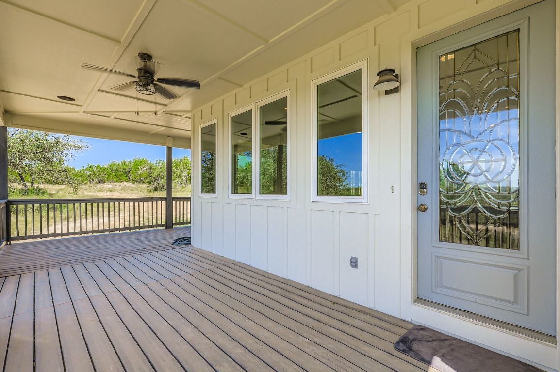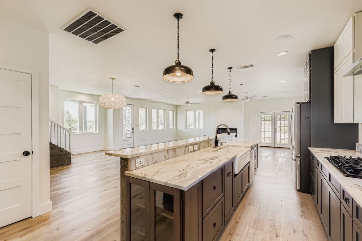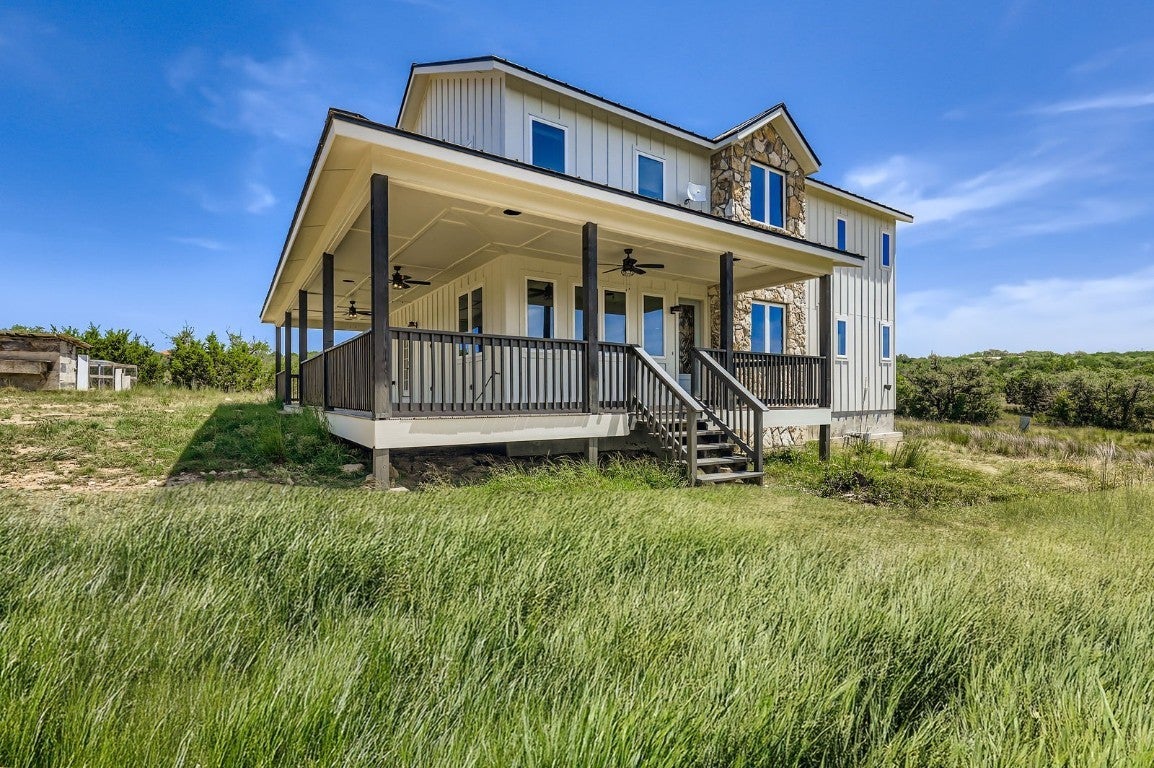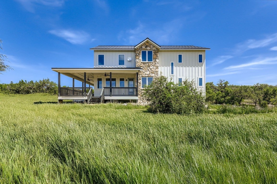 Perched atop a scenic hill in the heart of the Texas Hill Country, this stunning 4-bedroom, 3-bathroom farmhouse offers the perfect blend of rustic charm and modern comfort. Set on 8 acres of natural wooded beauty, the property provides unparalleled privacy, breathtaking views, and endless opportunities to enjoy the great outdoors. Step inside to find an open-concept floorplan bathed in natural light, ideal for both everyday living and entertaining. The spacious kitchen is a chef’s dream, featuring stainless steel appliances, a generous center island, and a walk-in butler’s pantry for added storage and prep space. The thoughtfully designed layout includes a private downstairs mother-in-law suite with a full bathroom. It’s fully handicapped accessible, offering comfort and independence for multi-generational living or guests. Upstairs, you’ll find three additional bedrooms, two full bathrooms, and a versatile loft area perfect for a home office, game room, or additional lounge space. Enjoy tranquil mornings and starlit evenings on the wraparound porch, surrounded by native trees and Hill Country wildlife. Whether you’re looking for a peaceful retreat or a forever family home, this unique property combines space, style, and serenity in one exceptional package.